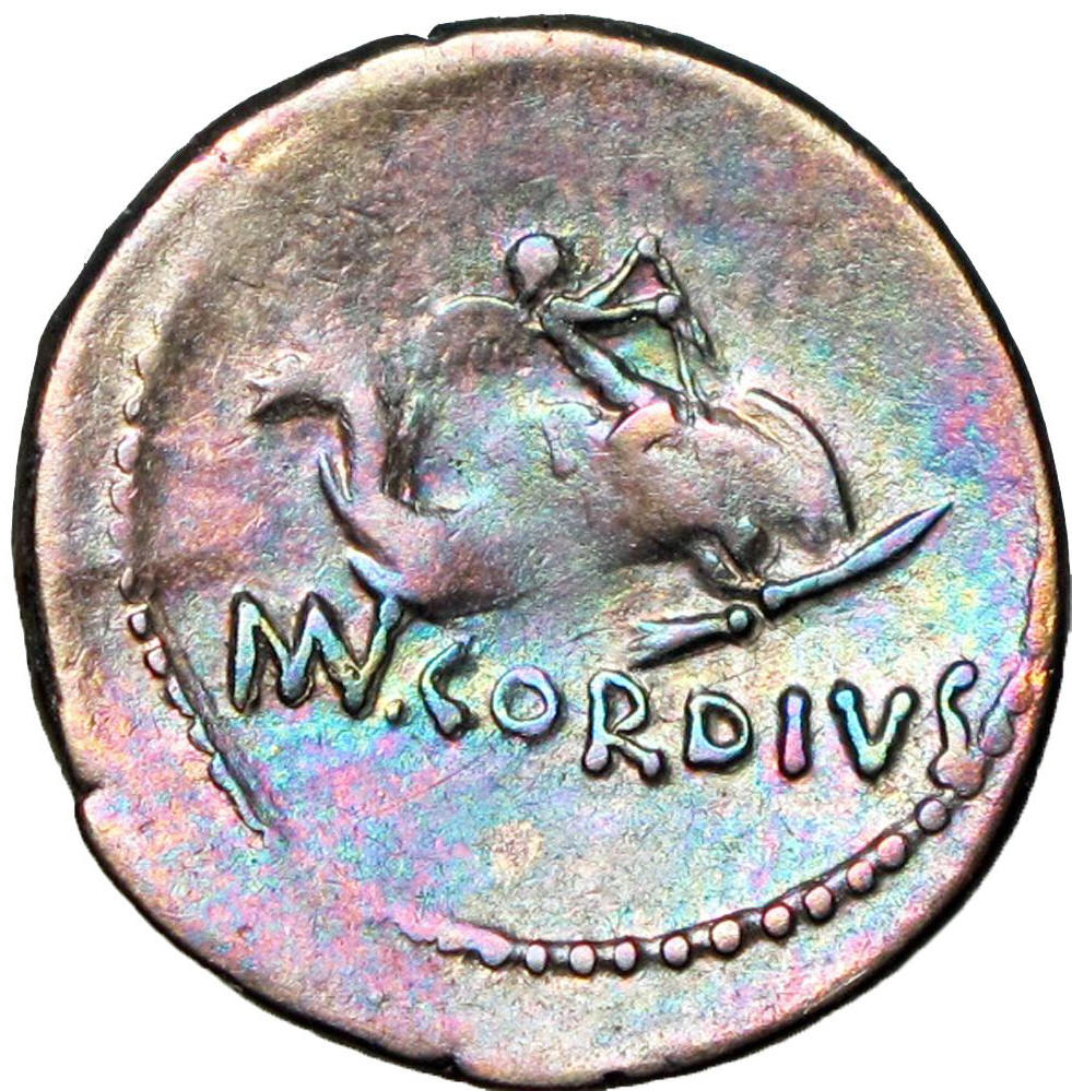 rysherms => that is actually "2" seperate coins: The first coin is => Mn Cordius Rufus (it is an AR denarius ... the AR means it is made of silver) The second coin is => Ionia Teos (it is an AR drachm)
