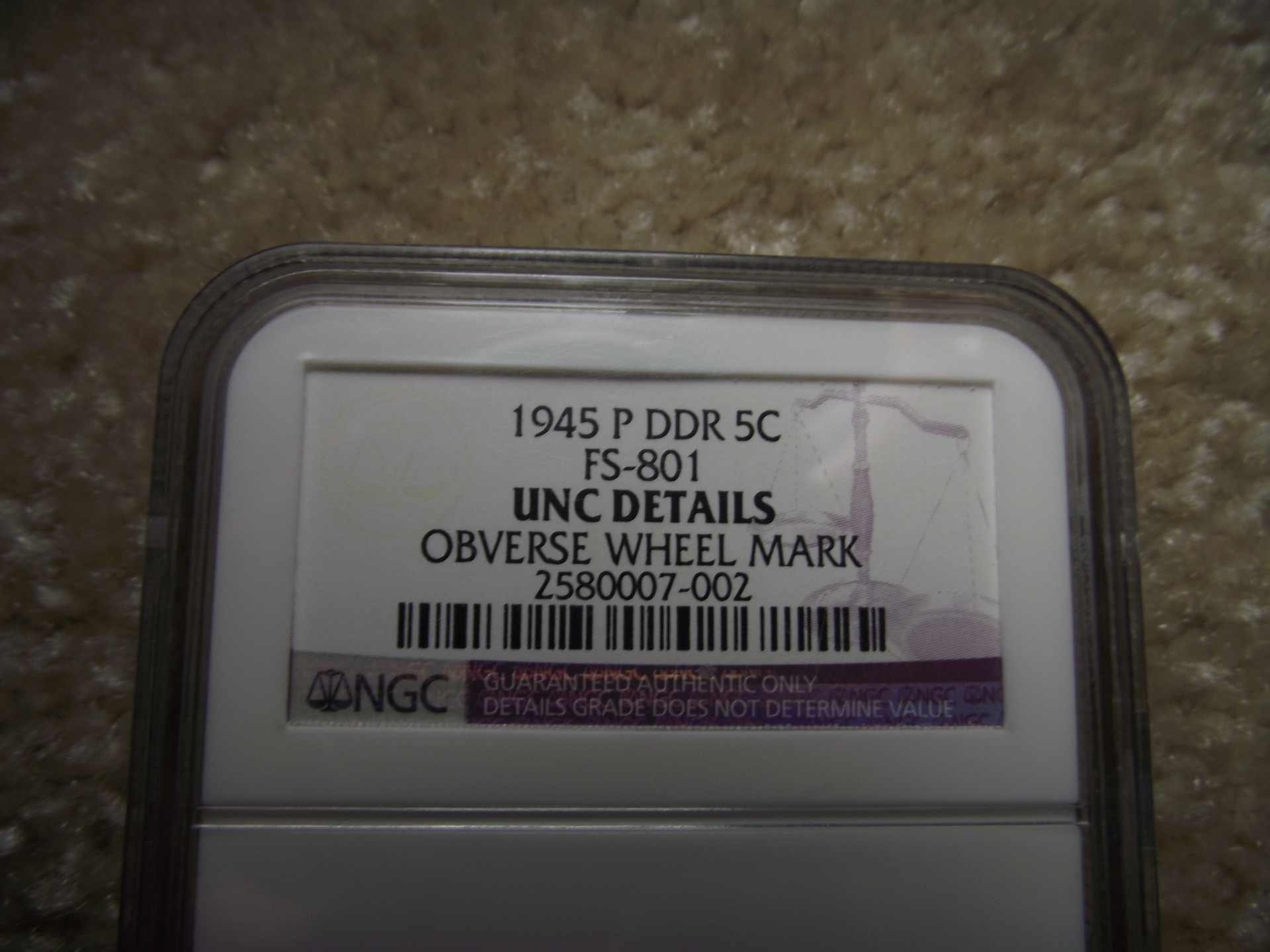 This is an uncirculated 1945-P nickel that has a double die. NGC identified it as "FS-801". However, it only received an "UNC DETAILS" grade because of an "obverse wheel mark". What would this be worth, and how does the "details" grade affect the value?