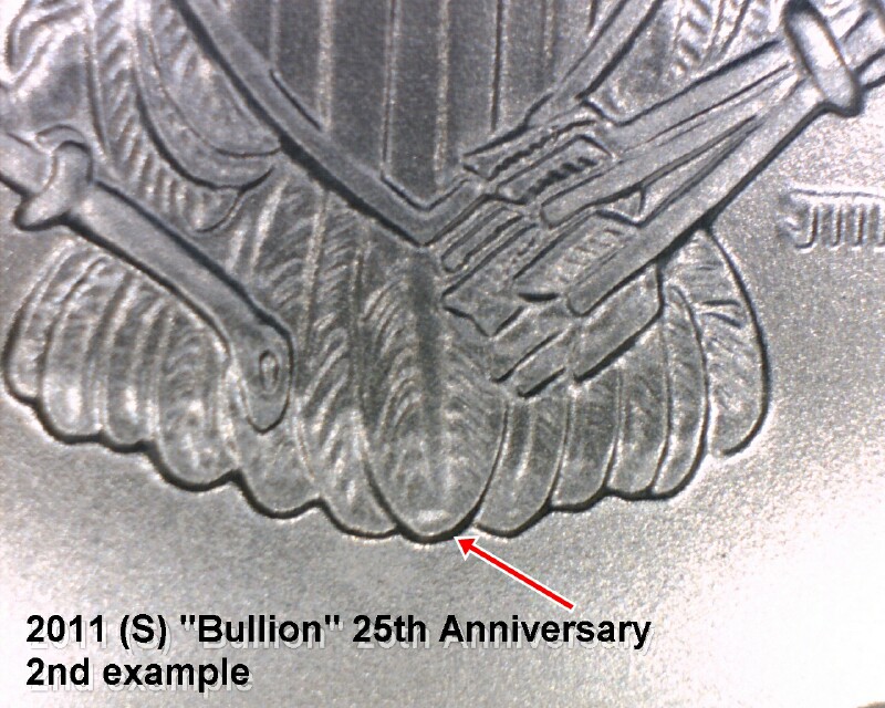 Very interesting marker, appears to be part of the design used for SF for the 25th set. My 25th bullions have this marker, as do my S Mint Uncs (It’s strongest on the bullions). My W Mint Uncs and Proofs do not have this marker. I also checked a 2011 W Mint bullion I purchased early in 2011, it does not have the marker.