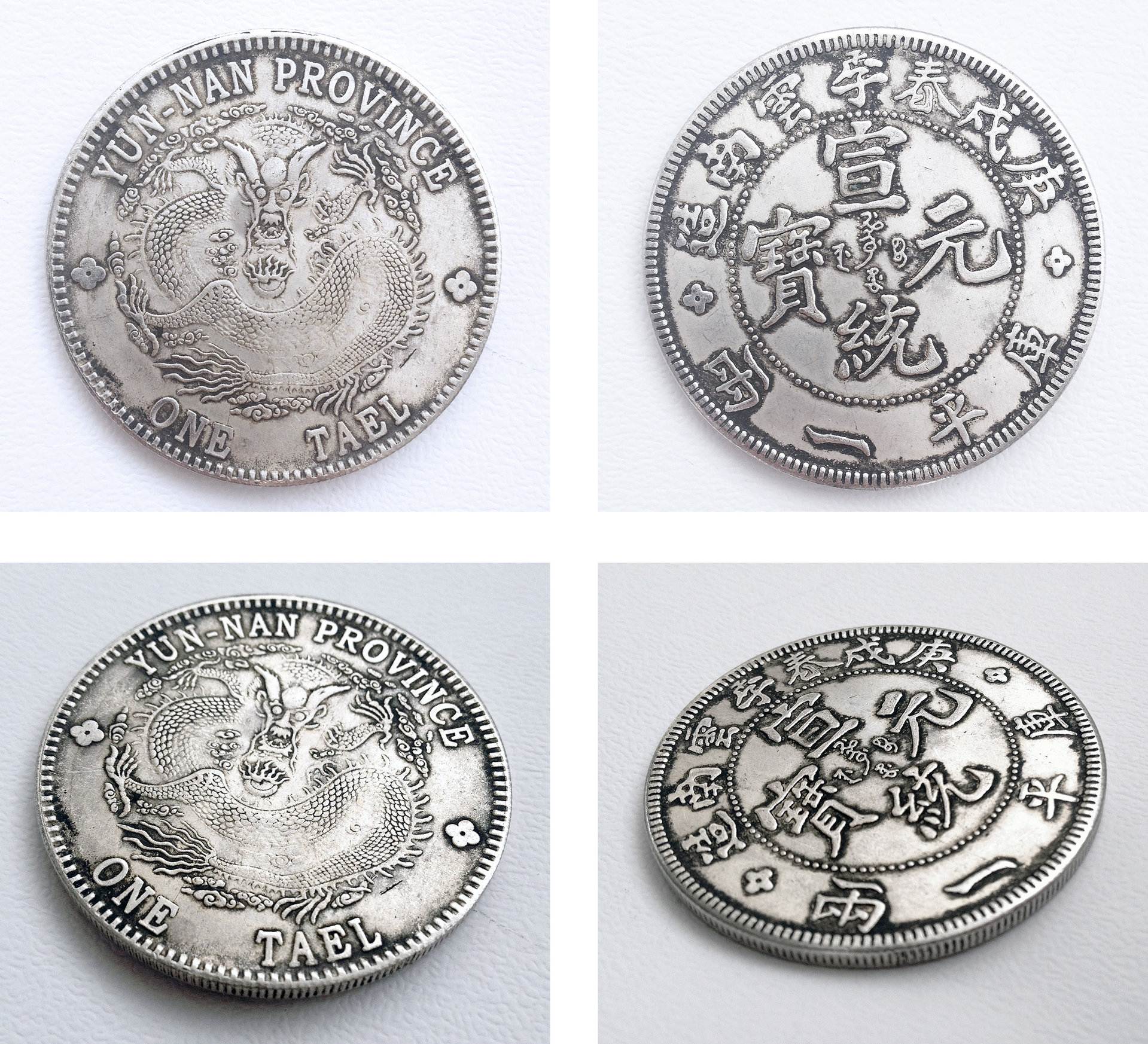 I did post about this coin already but I've got more details about it now to hopefully help make a more informed decision. - Was bought from a retired antique dealer - Weight: 29g - Is NOT magnetic - Has circulation wear - Has natural ageing - Deeper relief/engraving than fakes we've seen - Has 7 characters across the top (different to others we've seen) - Has 'Spring' written on it which no others have (apart from Spring Dollar we've heard of) The 7 characters across the top of the coin read: GENG XU QUN JI YUN NAN ZAO Which means: MADE IN THE YUN-NAN PROVINCE IN THE SPRING OF THE GENG XU (1910) Has anyone seen another out there the same as this? We have some fakes from elsewhere but this one seems a lot different and we can't find any pictures of one with the same engraving (or featuring the word SPRING). Thank you for reading!