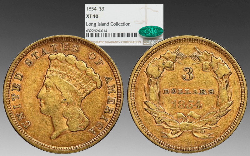 United States: 1854 gold 3 dollar piece, Indian Princess NGC AU58. Cert. #3152674-004. Numista-23121, Krause-Mishler-84. Mintage: 138,618. Ex-Erie Gold & Silver, at their table at the 2025 FUN show, Orlando, Florida, 12 January 2025. Purchased in an older NGC slab which was subsequently reholdered. The $3.00 gold piece was a unusual denomination, particularly considering that the United States also issued $2.50 and $5.00 gold pieces at the time. They were never issued in great numbers and saw relatively limited circulation, mostly in the Western states. By the time of the economic disruption of the Civil War, they seldom circulated in the East. This particular date, the 1854, is the most common, with a mintage of only 138,618 pieces and 15 extremely rare proofs. So all $3.00 pieces are reasonably scarce as collectibles today. This particular example is just short of Mint State and has, in my opinion, nice eye appeal. I purchased it in an older NGC slab which was likely more than 20 years old, but I sacrificed that when I sent it off to NGC for Photovision imaging and reholdering, as I wanted high-quality photos of the coin. This coin upgraded my previous example, which was another 1854 from the Long Island Collection, in an NGC XF40 CAC holder. The previous coin had even nicer color, but this one is a worthy upgrade since it is 18 grade points higher. 200000