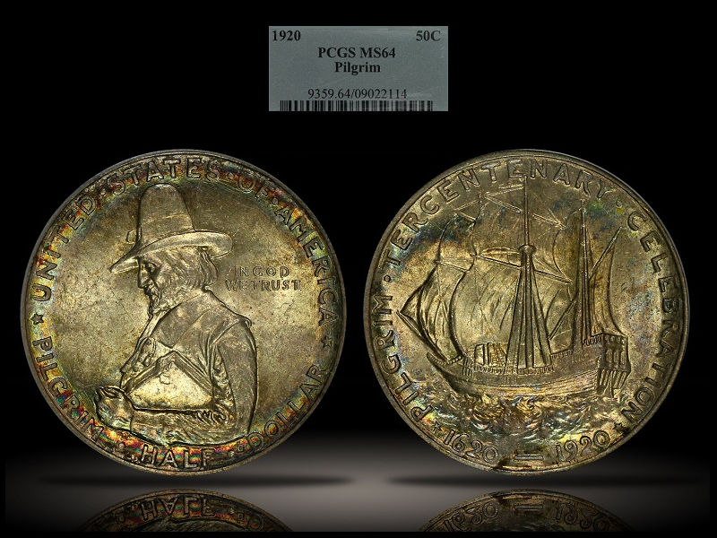 United States: 1920 silver Pilgrim Tercentenary commemorative half dollar NGC MS65. Cert. #103302-002. Numista-4398, Krause-Mishler-147. Original mintage: 200,112 (of which 48,000 were later melted). Provenance/source unrecorded; I forget. I likely acquired this coin on the Collectors Universe Buy/Sell/Trade forum in the late 2010s or early 2020s. This commemorative half dollar was designed by the sculptor Cyrus Dallin. It was first struck in 1920 to celebrate the 300th anniversary of the founding of the Plymouth Colony by the Pilgrims. The obverse of the coin portrays the Pilgrim governor, William Bradford, holding a bible. The reverse depicts the ship Mayflower, upon which they came to North America in 1620. Coins of this type were also struck in 1921 but sales were weak. Most of the 100,000 mintage for that year were melted, with only about 20,000 of the 1921 coins surviving. I am a descendant of William Bradford through my maternal line, so this was a must-have type for me. This piece upgrades a PCGS MS64 example I previously owned. This coin is housed in a Generation 5.0 NGC holder, and thus was encapsulated circa 1992-1995. Collectors refer to this type of early NGC slab as a "No-Line Fatty". Here's another bit of trivia about this coin type. Note the small "D" below William Bradford's elbow on the obverse (to the left of the larger D in DOLLAR). This is the initial of the designer, Cyrus Dallin. However, I have seen people (including the old Accugrade grading service!) mistake that small D for a mintmark. These coins were struck at Philadelphia like all commemoratives of the era, and not at Denver. 017500