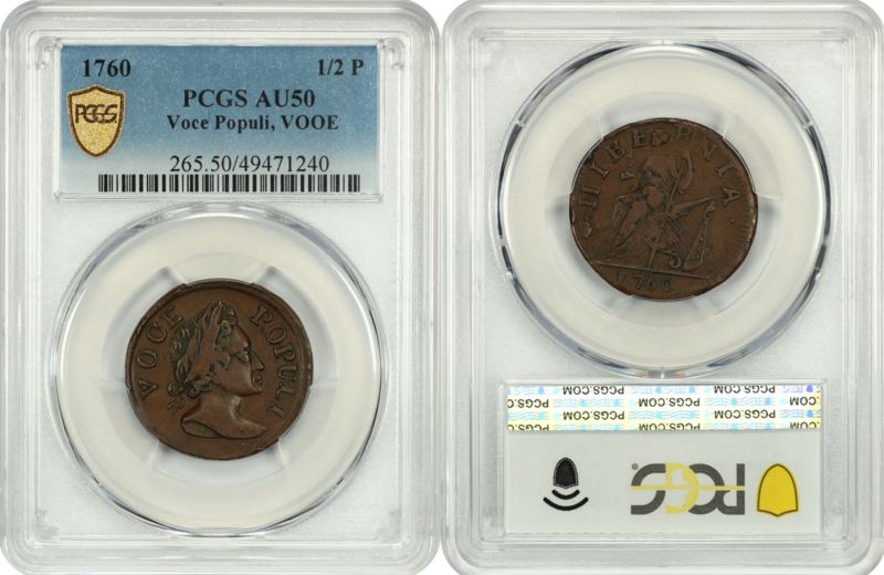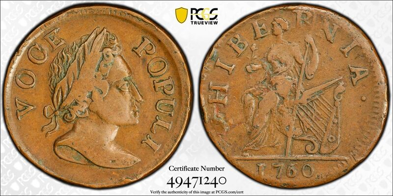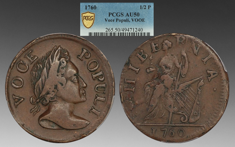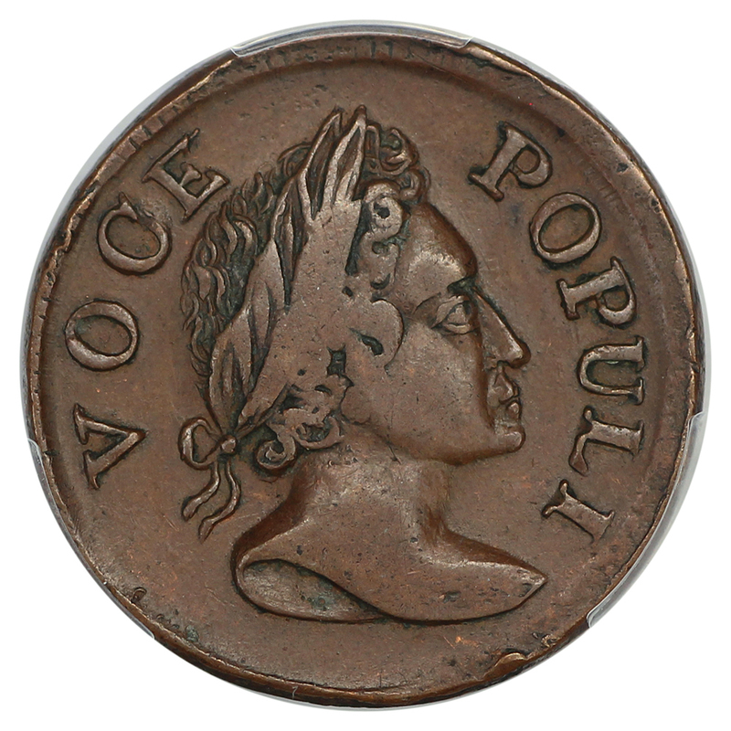 Though struck for use in Ireland, this issue circulated in the American colonies, and as such is listed in the Colonial section of the "Red Book" of United States coins. "Voce Populi" is Latin for "Voice of the People".