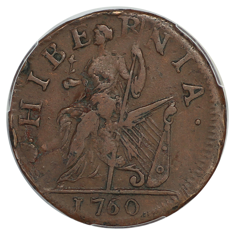 Very little is known about the origins of these coins, all of which carry the date 1760. Traditionally they have been attributed to a button maker named Roche, on South King Street, Dublin. Roche was, at that time, engaged in the manufacture of buttons for the army. He would have had the die-making skills [and] the raw materials to produce tokens like these. It is thought these coppers may have continued to be produced through 1761 using the 1760 dated dies."