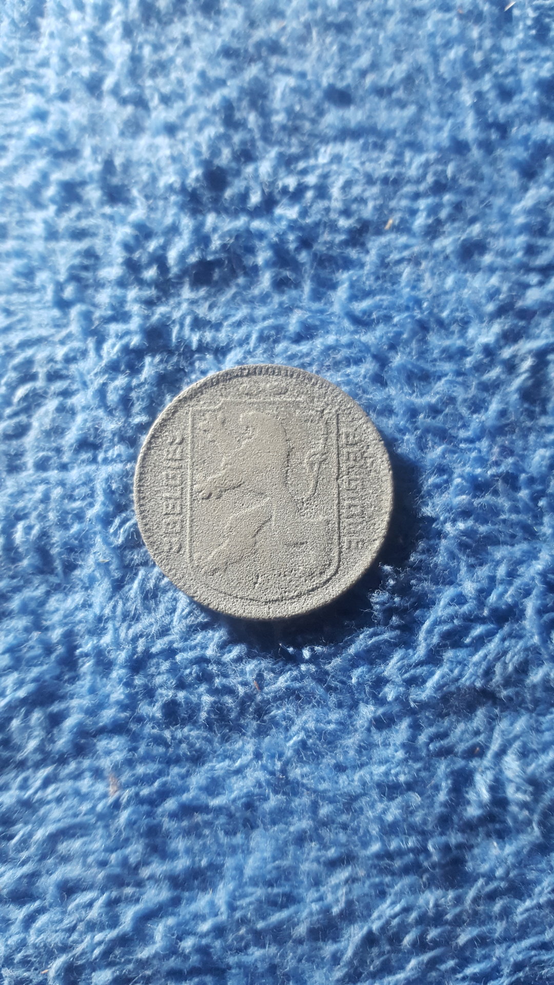 Belgium 1 Franc 1943 (I think). Made from zinc during WWII. It has minimal value due to the condition and lots were brought home as souvenirs after the war.
