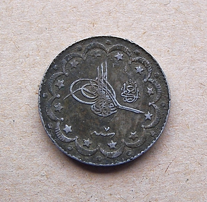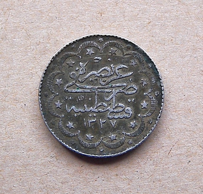 your coin looks like this 1 on Ebay. link: https://www.ebay.com/itm/1327-1-190...h=item3fad81ea3f:g:vt8AAOSw3ZtaKcm7:rk:1:pf:0 1327//1 1909 TURKEY 5 KURUSH .830-SILVER KM#750 I do not know what grade your coin is ? VG-F ? $15-30 dollars... could be higher I do not know the current market value for these.