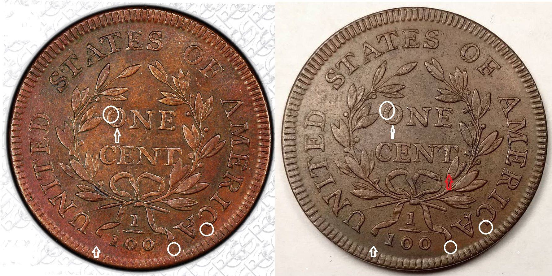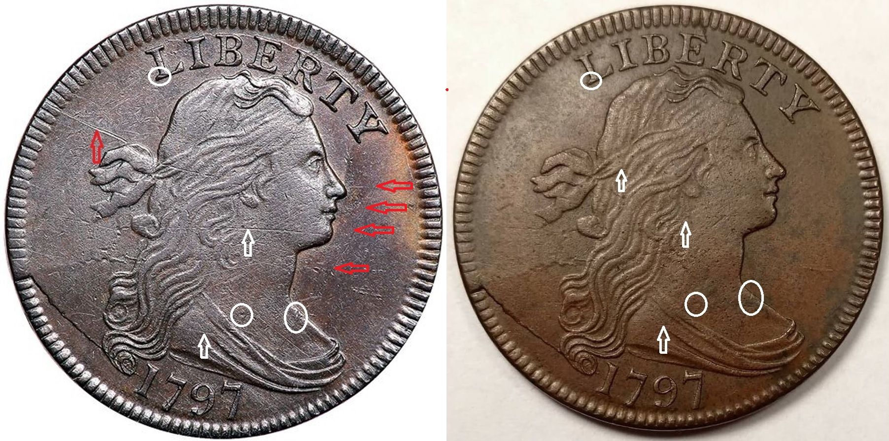 Another important thing to notice is that some of the die cracks and clash marks were removed from the counterfeit dies. It is a common practice by the counterfeiters for some reason, and it often results in “impossible” die states.