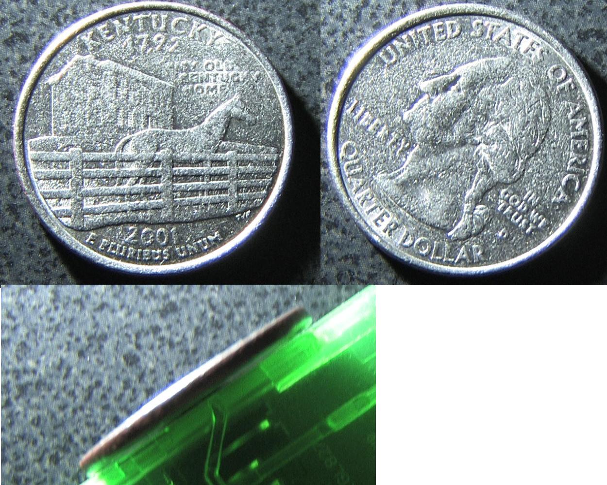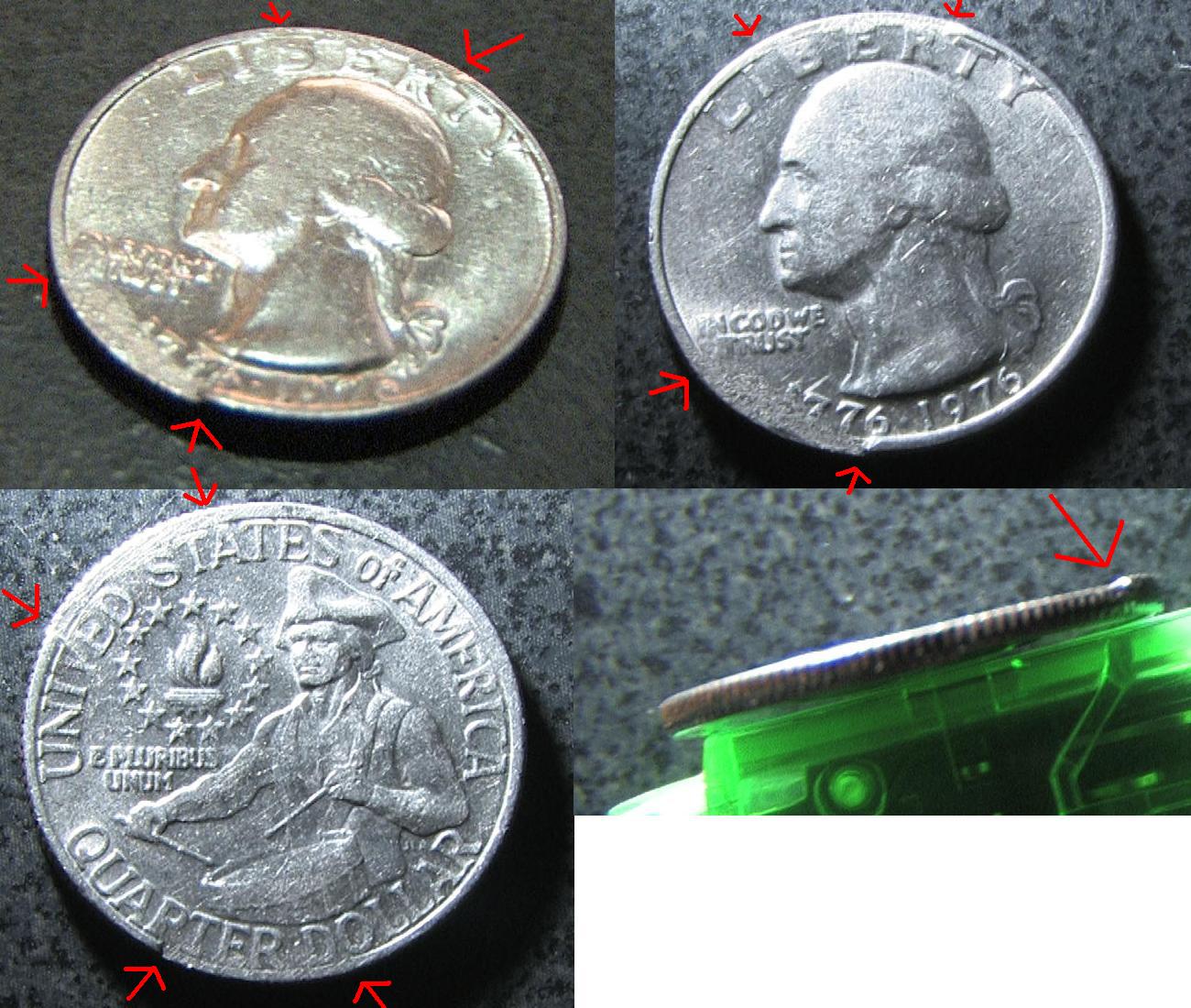Alright, I have two here that I'm not sure about... I'm not exactly up to date on all the kinds of errors that are out there so maybe someone can help me out with these because googling has given me little result - The first coin is a 1976 quarter.... it looks like it was smashed with something... because its damaged on both sides of the coin in the same spots... (The edges) .. however the entire middle of the coin is completely intact on both sides and shows no signs of being smashed like the edges... if you look at it from the side you can clearly see gouges in the coin where part of it is wider than the rest... this is where the "T" in "United" is at and the coin almost looks cracked.. - The second is a 2001 Kentucky State Quarter... the entire thing looks like its blurred/oil/grease was in the die... the closest guess I have for it after searching is possibly a weak strike? I honestly have no idea.. both sides are the same... and the entire side of the coin has no reeding on it... its completely smooth (Hard to see in picture, sorry)