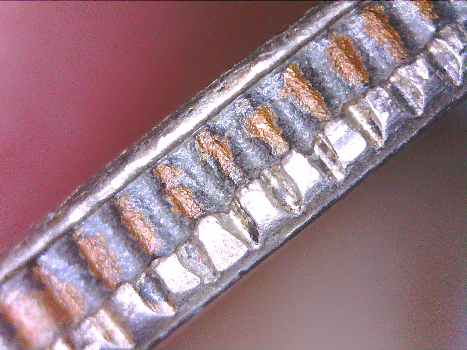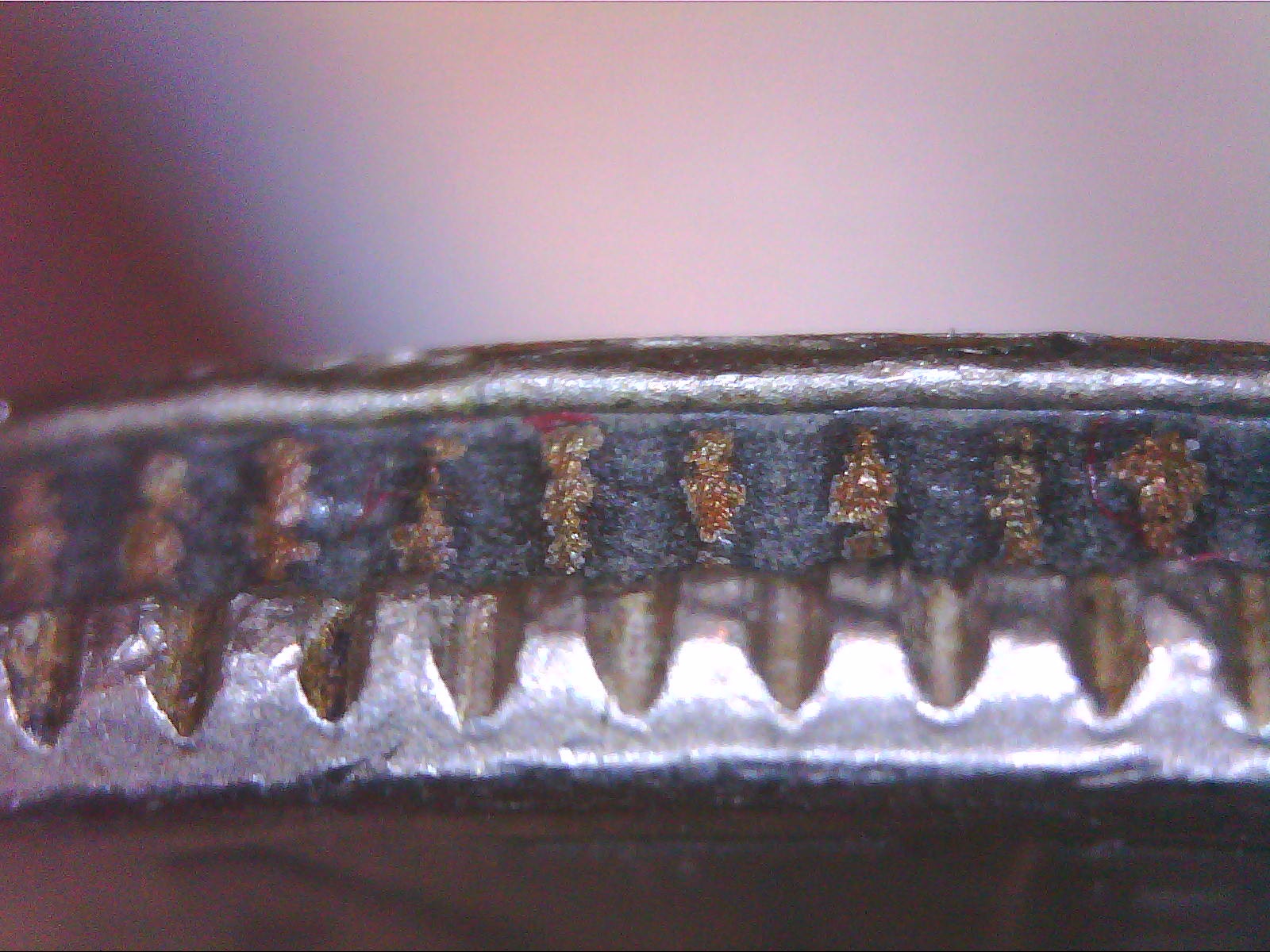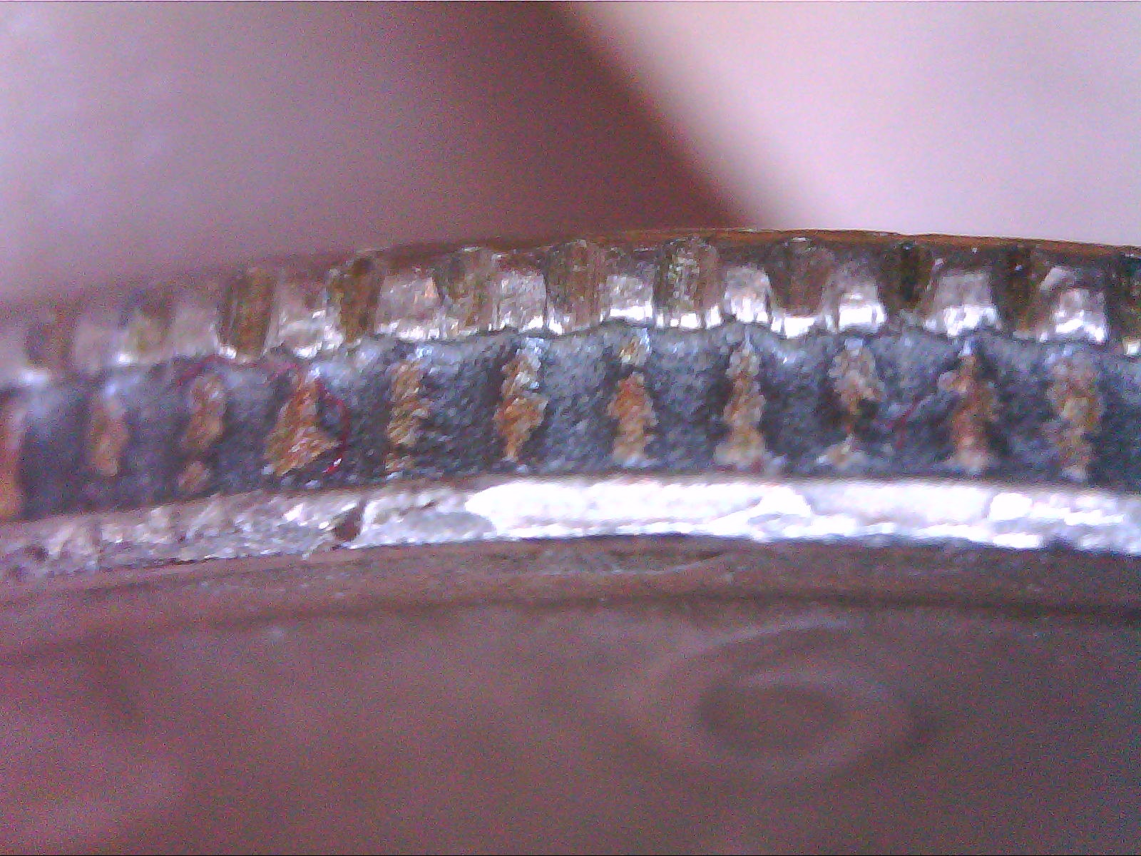 I thought it might have been caused by acid too, the core layer looks pitted and filled with a black residue between the reeds, but I got stuck on why the obverse edge is so nicely rounded where it meets the core. ?? I also have another coin that seems to have been exposed to acid but it was the outer layers not the core that was affected: