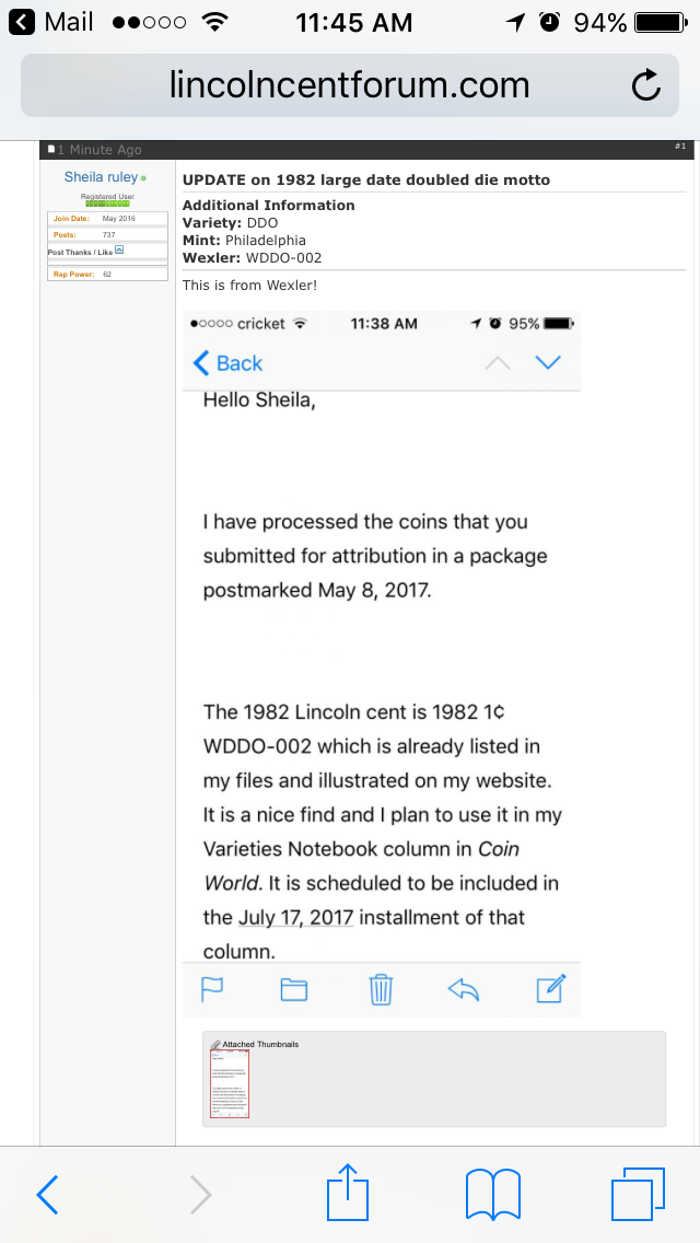 Please correct me if wrong, but I assume you're referencing this one? https://www.cointalk.com/threads/1982-large-date-doubled-obverse.295989/ Very, very cool, Sheila! And as always, a heartfelt congratulations! This is what, the second or third time you've had a find used in his column? I've said it many times before, but you continue to be an excellent example for those new to the hobby, and particularly those interested in varieties. Kudos! And the Wexler link for anyone so inclined... http://doubleddie.com/828781.html
