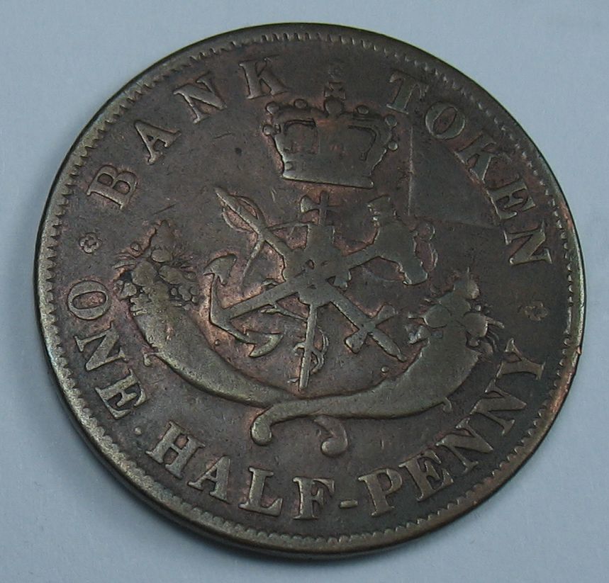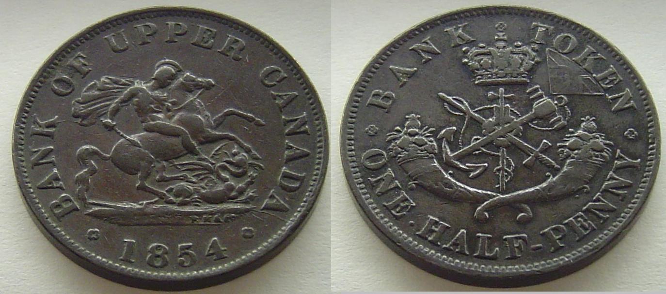 1854 1/2 penny token I don't know if the 1854 half penny is less valuable than the 1852.... I got this one for either $4 or $6 USD at my coin shop's bid board maybe 2 or 3 years ago at most. I always loved the design of this type of bank token though. Beautiful example Ikan. I would agree the OP's coin looks F or so, but I'm not good with grading Canadian coins let alone Canadian bank tokens. My photo is a bit large and needs to be clicked on to see fullsize. EDIT: avi : I think he was saying that the coin Ikandiggit posted is XF or more. I consider mine about VeryFine.