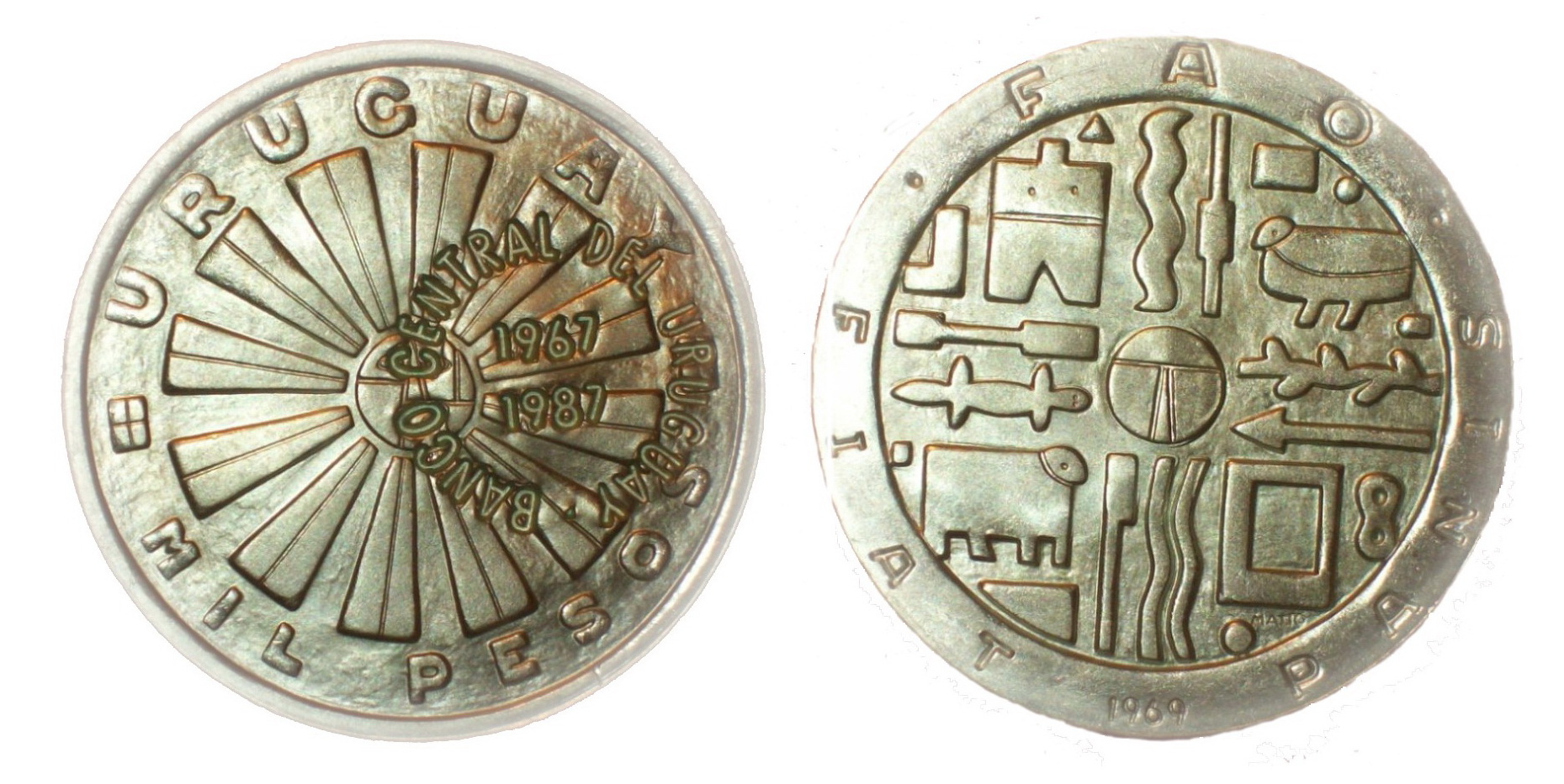 Cool collection! I especially like those somewhat abstract designs, such as the 1000 pesos FAO coin dated 1969, or the millennium piece from 1999. I cannot really tell from the picture, but aren't the two FAO coins (top row/second coin from left) and second row/third coin) the same issue? Similarly, the two "20 Years BCU" coins - but I don't know that much about coins from Uruguay ... As for the "missing" one, hmm. My catalog does not list even list it, just the one with the sun face. Christian
