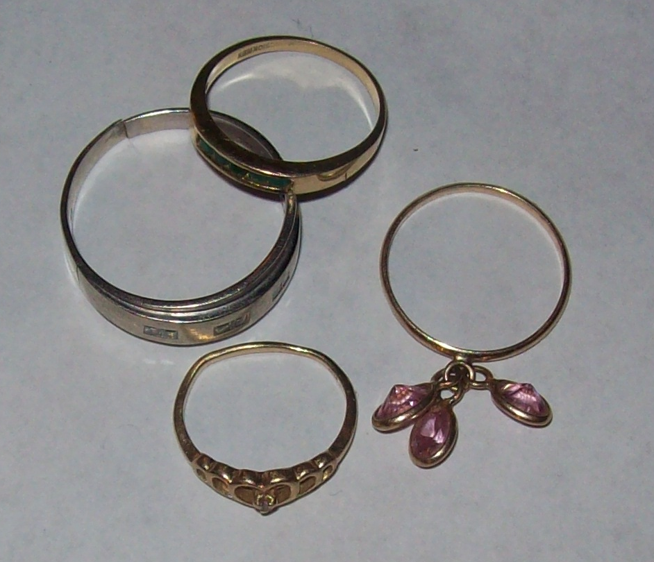I found a gold ring which has blue diamond chips in it. I asked my gold guy if the diamonds are worth anything: "Not if you are selling." At least he's honest. No diamond rings but 4 golds. The big one has the chips. It wasn't broken until I dropped it on my porcelain tile. Crappy 10K mixed with nickel silver. I thought it might be mixed with titanium which is brittle, but the gold guy said no.