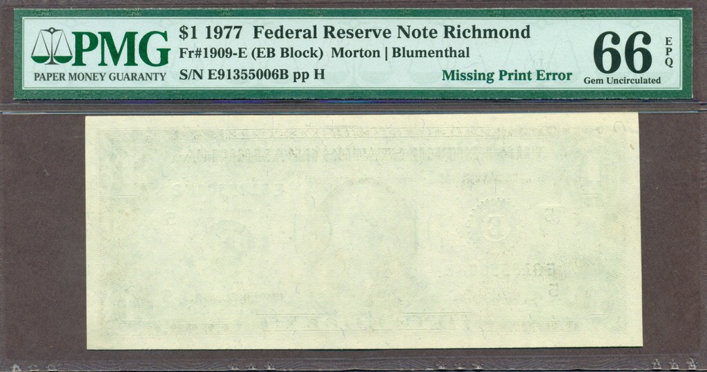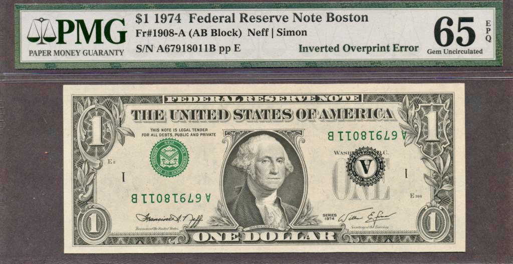 A 1977 Ace missing the first print, or as some collectors call it, a Blank Back. And a 1974 $1 note that was part of a sheet that received an inverted overprint.