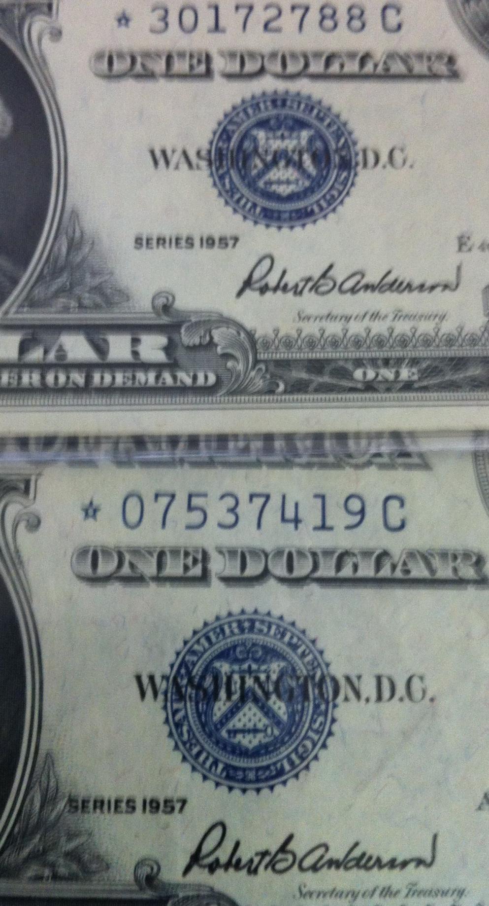 1957 $1 STAR *07537419C CHCU possible misasligned print, "SERIES 1957" is adjusted slightly over to the left, as are the signatures. I have gone throught hundreds and hundreds of silver's, but I have never seen one like this, I am not sure if it is bad enough to be considered an actual 'error note'. In this picture, I have posted a similar note same series, prefix and suffix. The one on the top is normal and the one on the bottom is the one I think might be an error.