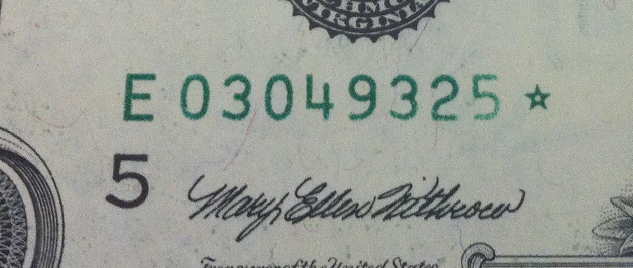1999 $1 STAR E03049325* XF possible low ink error in left lower serial number. The last '2' and '5' of the serial number are sort of low on ink, they weren't inked on all the way. Believe me when I say, the photo does no justice at all for the note.