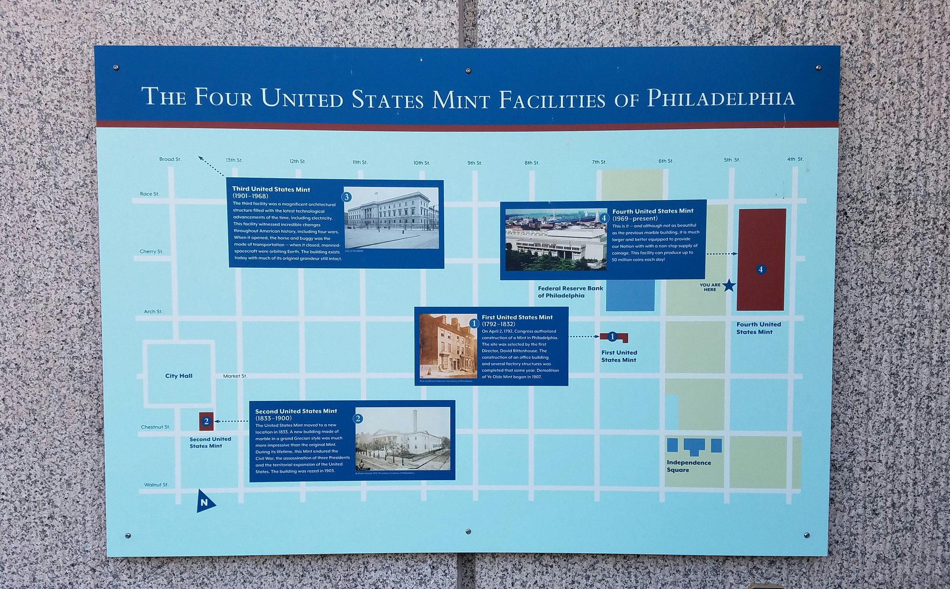 Not sure how many folks know this, but Ben Franklin's grave is right across the street from the Mint. Ironically, folks passing by throw coins that were probably made across the street on his tomb. This is literally how close they are...