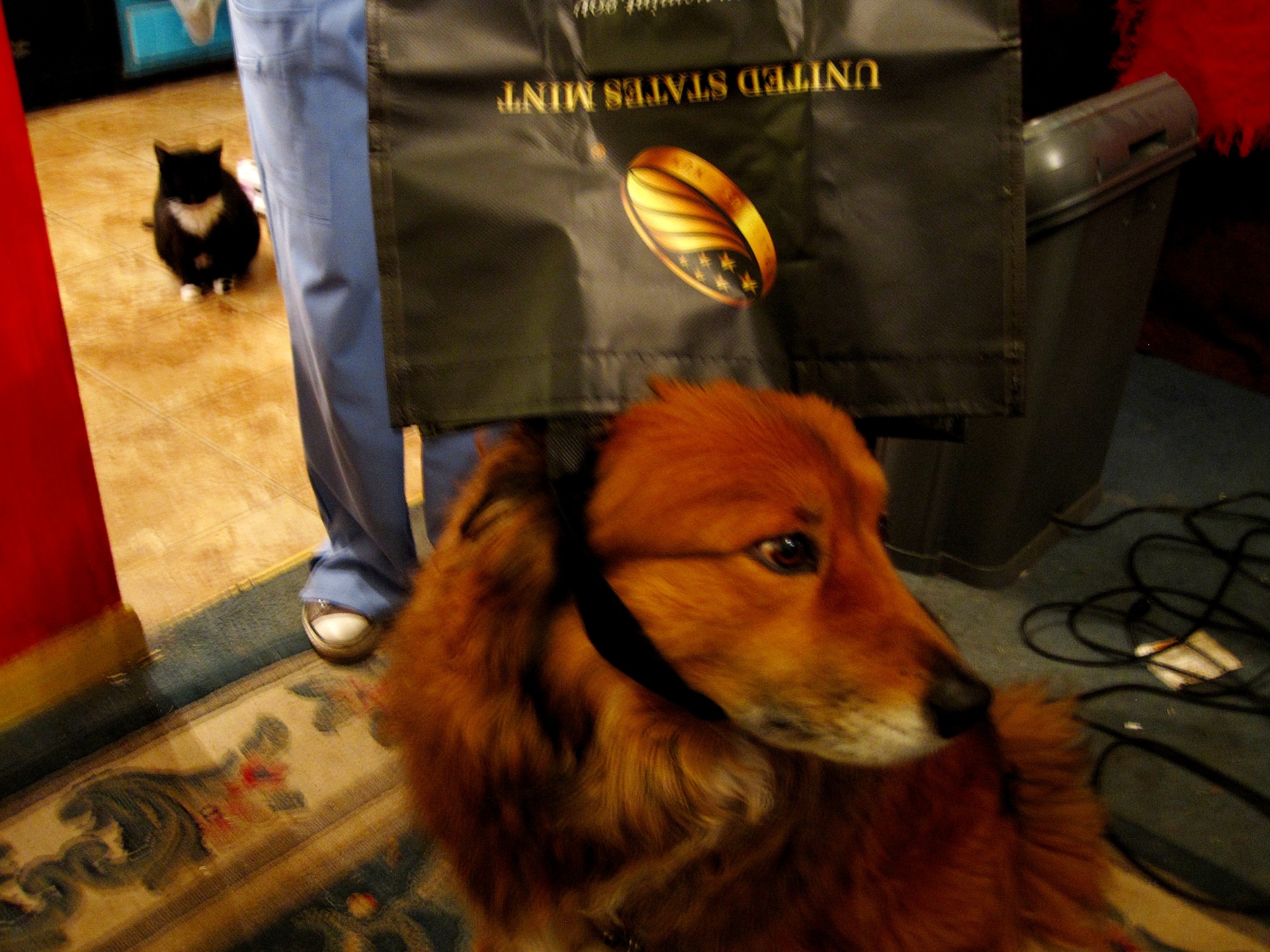 I say fill it with toy money (type to teach kids how to count bills and coins), put a sign under the logo that reads, "Free Money!!" Sit the filled bag out in public and sit to watch the fun unroll. By the way, I have two tuxedo cats of my own and compliment your Sylvester.