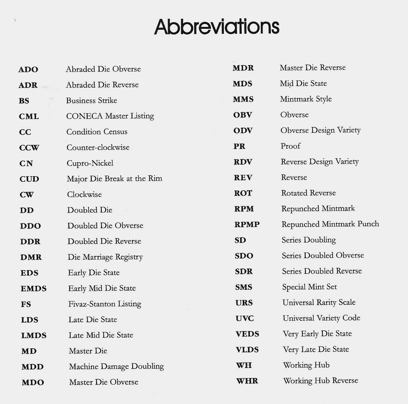I think you solved this for me. Why are we so lazy now-days that we need to use abbreviations for everything? why not just say broad struck , off center , struck thru die cap , doubled die , worthless mechanical doubling or whatever the error or variety is ? this abbreviation crap is too confusing for new coin collectors.IMHO