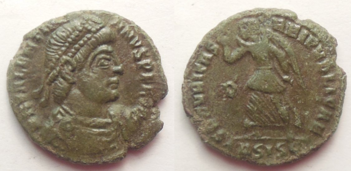 Valentinian I AE3. Siscia mint, 364-375 AD, 3.4g, 18mm OBV: D N VALENTINIANVS P F AVG, Pearl diademed, draped & cuirassed bust right. REV: SECVRITAS REIPVBLICAE, Victory advancing left with wreath; D in left field. Mintmark Delta SISC. REF: RIC IX Siscia 15v This coin is much like the Gratian coin I just posted with fewer workshops but still lots of them. I didn't find a exact match but then lots of varieties are lumped into this one catalog ID number. Wikipedia copy and paste history.