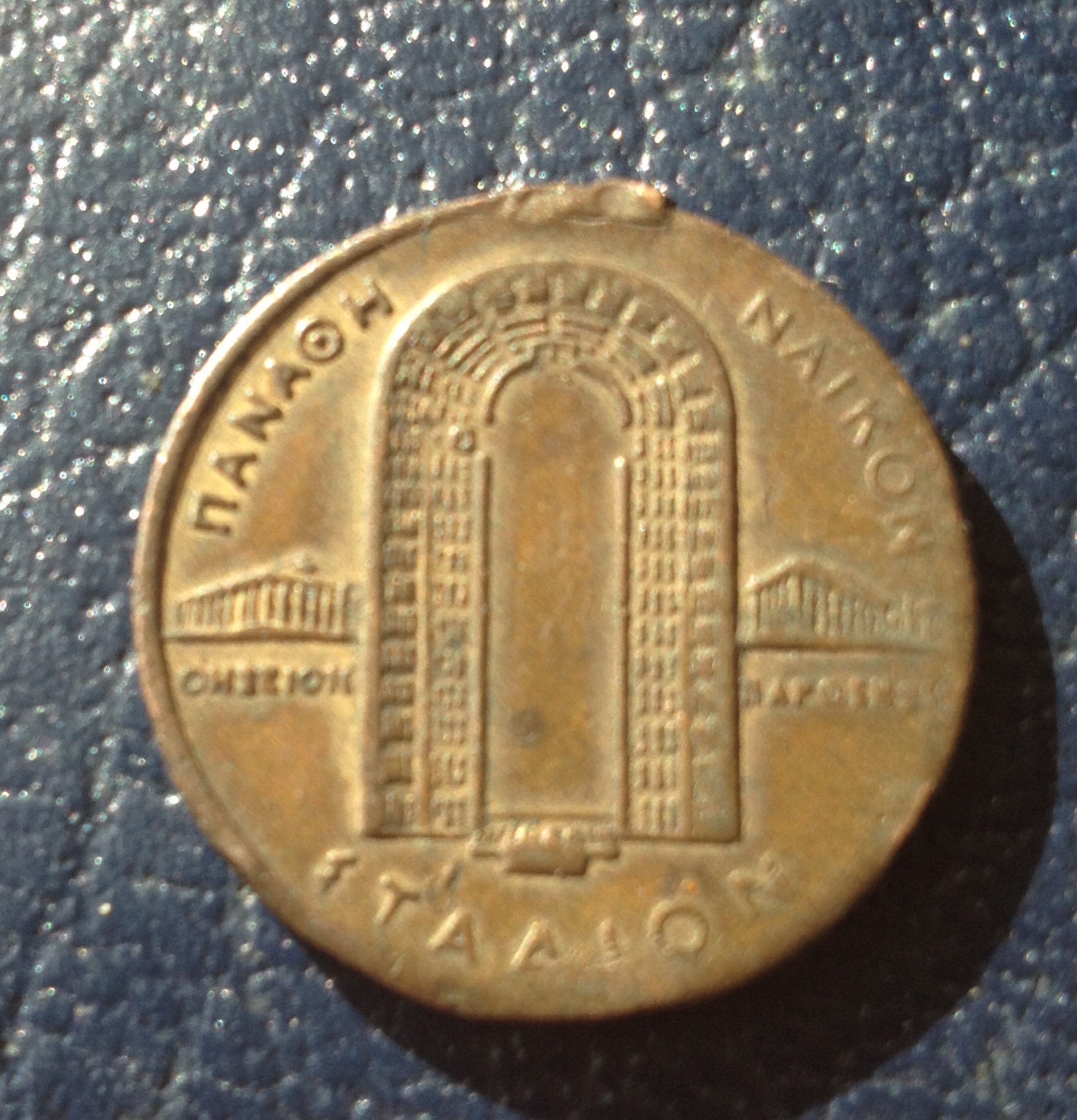 The medal originally had a pin & ribbon attached to it. The damage occurred when someone removed it. The medal was struck in silver with a 24mm plain edge by engraver Maison Nissiotis, and it is estimated to be worth $240 in VF and $300 in EF in original condition. Source: Olympic Medals and Coins; 510 B.C. - 1994 by Victor Gadoury Chris