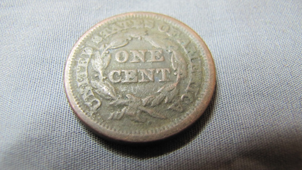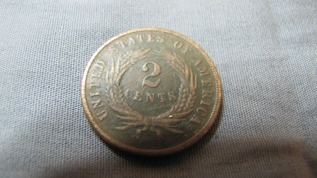 I need help with the value of a couple different kinds of pennies that came into my store the a few days ago. This 1887 Indian Head has some nice detail, but I'm not sure what all of the discoloration is, especially on the back. Does that kill the value? There was also 3 large cents, however 2 of them are pretty rough, here is an 1848 that is in the best condition. This 1865 2c piece has a reverse that is a little offset from the the obverse, is that rare? Thanks