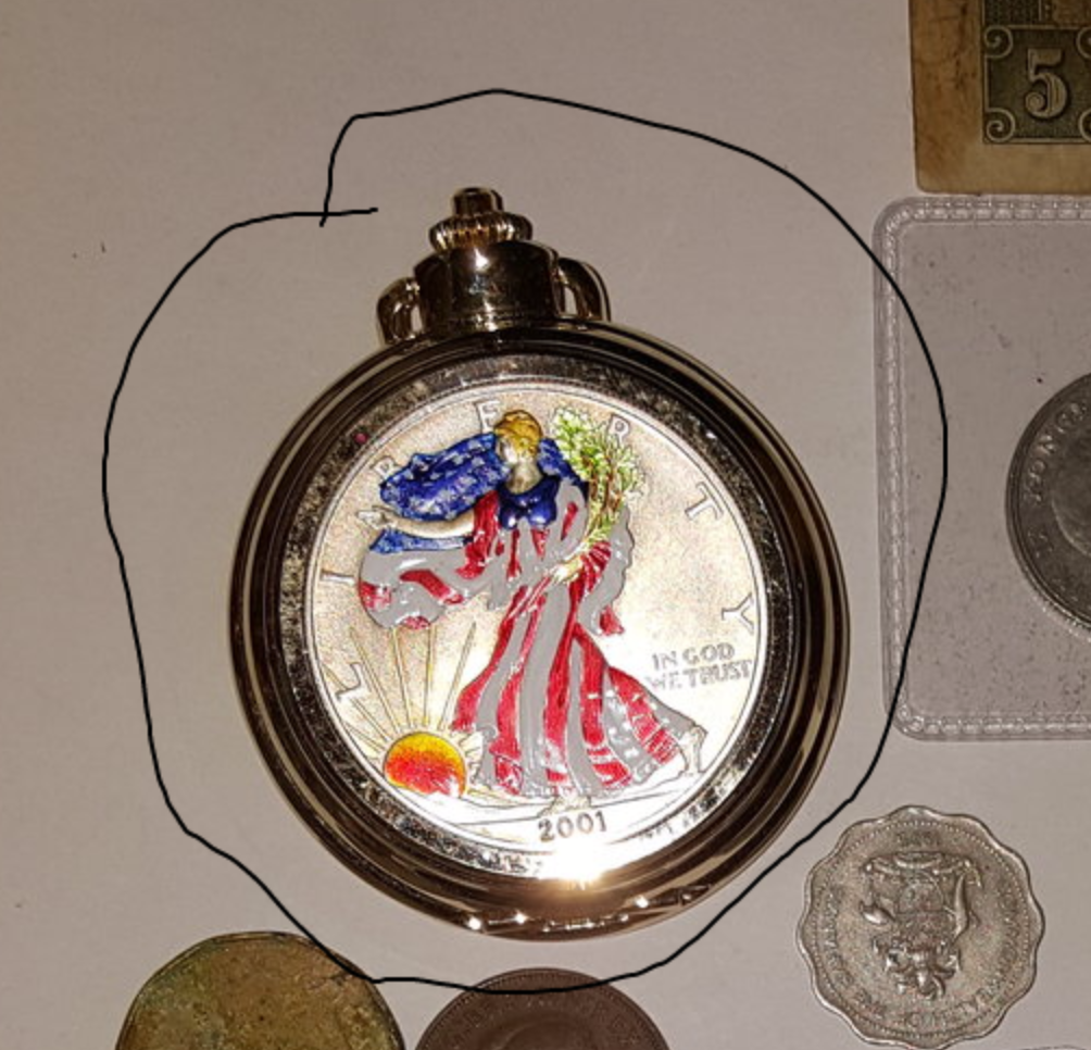 Hey theres lots of coins there! The coin in the middle of this has been colorized (after mint) but was made by the US Mint. It is made of 1 Troy Ounce of Silver, worth around $20. Can I see some closeup images of this? Both are on front page.