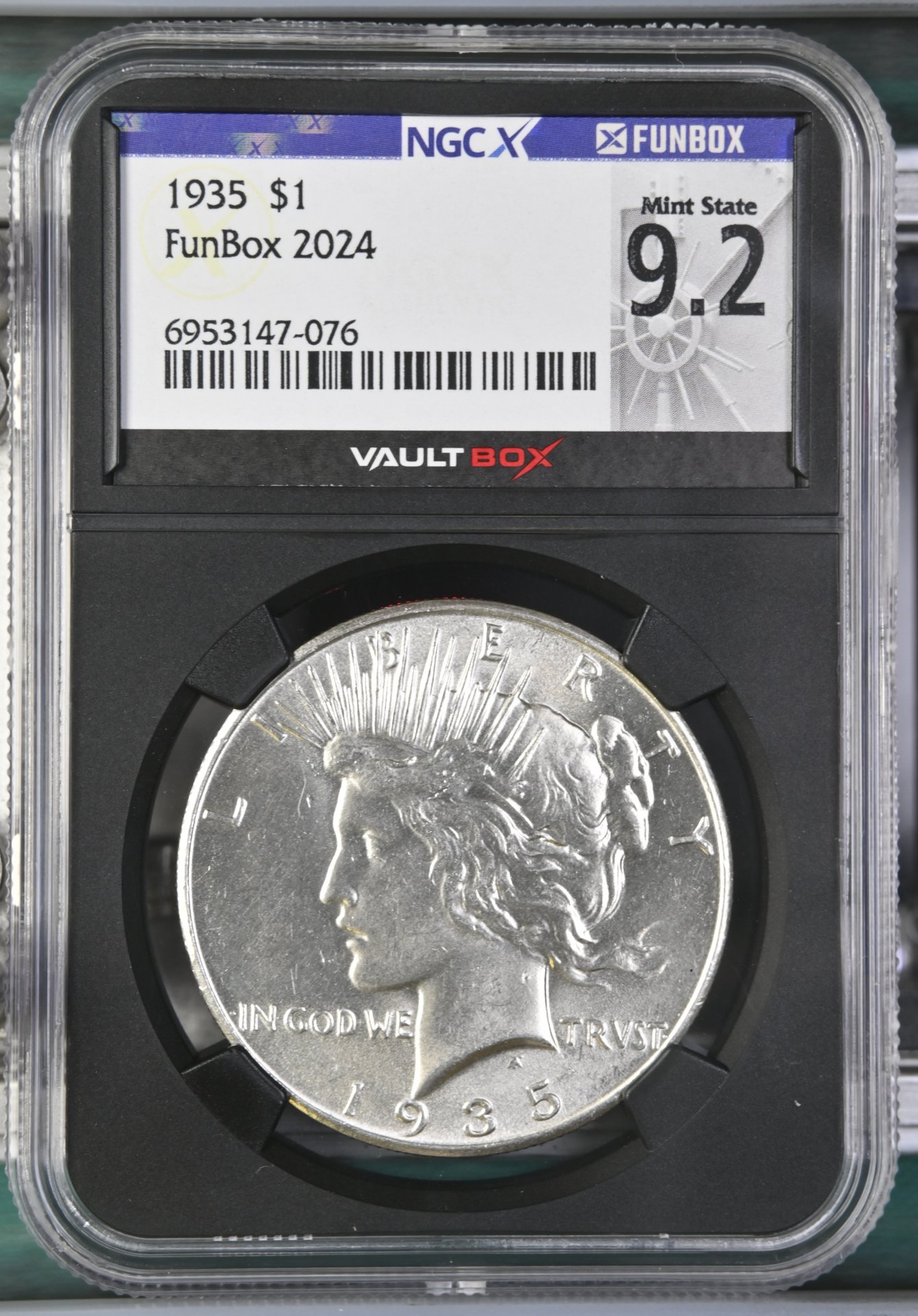 And last but not least (and maybe not last my brother got 9 the sneaky SOB trying to get him to sell me one more lol) Anyhoo.. the last of my present 3 black core 66.8g Oh.. ok I like, not what I wanted, but I still like and fills a spot in my peace dollar set (mostly icg slabs but this makes the 2nd NGCX in the set the other being from series 7 vaultbox my 27d) So here's number 3 a very pretty 1935 peace dollar in 9.2/MS62 NGC list 160 PCGS list 240 so a wide spread on this one, but I'll call it a win