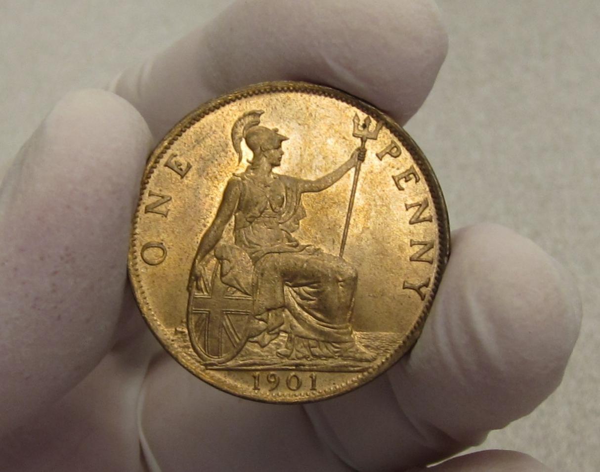 really beautiful example of this coin, the veiled hed victoria pennies are the easiest to find from her reign in top grades as by the end of the 19th century coin collecting had become very popular in the UK and many of the 1901 coins were put to one side by many people because they were the last of victorias reign, just as no doubt many people will do exactly the same with elizabeth II when she dies, if you look at each monarchs coinage from the 20th century the last year of reign coins are the most common in the higher grades. that said it is still a beautiful coin.