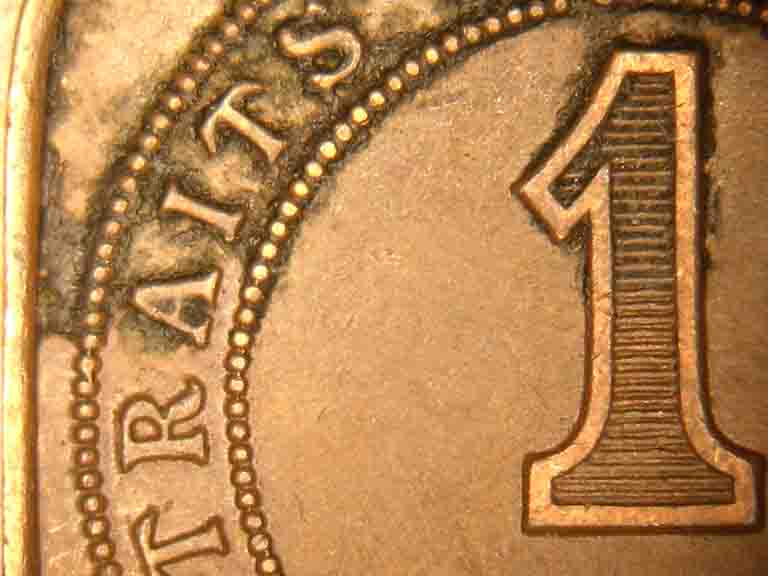 Detailed account of verdi-care test (long): Verdi-care trial (8/22/14 - 8/24/14) Methods I purchased one 60 ml bottle of Verdi-care from Wizard Coin Supply. The price was $15.99 plus 4.36 shipping, for a total cost of $20.35. This makes the cost of the product $0.34 cents/ml. Buying multiple bottles does not significantly reduced shipping costs per bottle (savings of ~$0.05 /per bottle for three bottles). The purchase was made on-line on 8/13/14 and the product was received on 8/21/14. The plastic bottle was wrapped in ~two layers of bubble wrap and packed in a padded shipping envelope, shipped via USPS First-class mail, and was received in good condition. I could find no lot number. I chose to test the product on a 1920 Straights Settlement 1 cent coin. This coin was chosen because it is in pretty good shape (VF, on a good day - low XF), had no apparent major environmental damage but was quite encrusted with dirt, and had some light to medium greenish material showing in a number of places. The latter appeared to be more associated with dirt build-up rather then affecting the metal per se. In addition, this coin has a bronze composition so it should be similar to other coins on which I intend to use the product (late 19th century, early 20th century British "copper"). Finally, the coin was not terribly valuable so there was a minimal financial impact if the trial went awry. For many years I have used 70% ethanol and pointed wooden sticks to remove heavy material from circulated coins. My goal was to remove all contaminants from the surface of coins (typically pre-1959 Lincoln cents with die varieties found while searching bulk purchases of coins). This was followed by immersion in acetone to eliminate moisture. Thus, I have extensive experience with "toothpick method" for removal of contaminant material. Initially, the coin was placed in the bottom of a 50 ml glass beaker containing ~500 µl of the product. A couple of extra drops were placed to the upward facing side to ensure complete immersion in the product. The coin then was allowed to soak for about 22 h. Although the beaker was covered, it was not air tight and thus it is unclear how much the product may have changed due to evaporation, oxidation, etc. I will conduct a future experiment to track weight loss over various periods of time. After soaking, the coin and as much Verdi-care as possible was transferred to the lid of a plastic quarter-sized coin tube (thanks bkozak33). I found that working in the beaker was untenable due to the depth of the beaker, thus requiring the transfer to a shallower container. Despite the inevitable loss of product the remained in the beaker (~ 10-15 µl), transfer to the plastic lid probably was cost effective due to the reduction in surface area across which the product would spread. The "toothpicks" were made by breaking round wooden applicator sticks (~ 2mm diameter, purchased from Fisher Scientific, ~ $6.00/ 200 sticks). In most cases the sticks break along the grain leaving two pieces, each which has a varying length of thin, rather flexible wood. This end then is trimmed to about a 45 degree angle point using scissors. This trimming was repeated at regular intervals (~ every 20-30 seconds) to maintain a point and to eliminate contaminants the adhered to the toothpick during probing (I have found that contaminants on the toothpicks are the most common source of scratches in the surface of a coin if the sticks are not trimmed regularly). I used about 6 applicator sticks on this coin. One limitation to using wooden applicator sticks is that, after the sticks are trimmed to a new point, they wick up a significant amount of solvent (this can actually be seen quite readily under the microscope). This wicking probably wastes about 25% of the total product used. Finding a "toothpick" that does not absorb the solvent would significantly reduce waste. In a future test, I will examine the feasibility of using plastic toothpicks. Actual work on the coin was done using a variable magnification boom-arm dissecting microscope at about 10X magnification with ring-light illumination from directly over the coin. I have no way to accurately measure the illumination intensity, but I was using relative low intensity lighting (about what would be achieved using a 60 W incandescent bulb at about 4 inches). Additional Verdi-care was added intermittently as needed. Removal of surface contaminants took about 3 1/2 hours of careful work with the toothpicks. After all of the initial work was completed, the coin was placed between multiple layers of paper napkins and a constant, relatively heavy, downward pressure was used to remove excess product. When examining the coin under moderate magnification (~20X) after removal of excess product, it was clear that a significant number of dirt particles remained scattered across the surface. I would expect that a "rinse" in clean Verdi-care after removal of the contaminated product that remained after cleaning would greatly improve the overall outcome by removing those remaining particles. I opted to roll a clean, dry cotton swab back and forth across the surface of the coin. This method was relatively successful at removing remaining dirt without "wasting" additional product, and without completely removing all of the remaining Verdi-care.. Results and interpretation: I decided to do only half of the coin rather than attempt before and after pictures with their inherent confounds of variations in lighting, angle etc. One caveat that should be taken into account is that the un-cleaned half of the coin was subjected to immersion in Verdi-care and the handling associated with cleaning the other half of the coin. As such, the extent of the encrusted dirt on the un-cleaned half probably was reduced slightly from the original conditions. I attempted to use only the probing method to dislodge dirt, however, at high magnification it is clear that I occasionally moved dirt grains horiz
