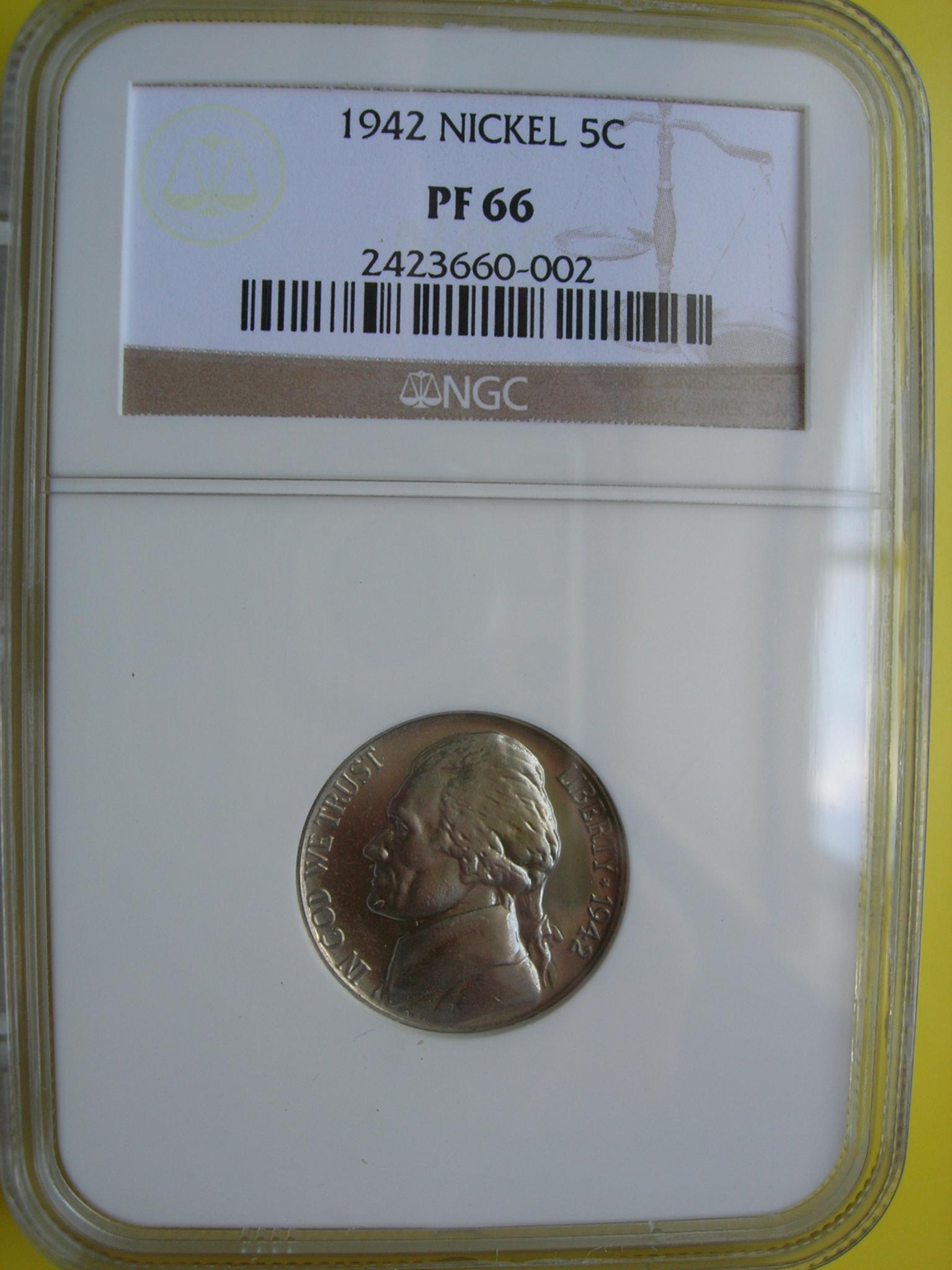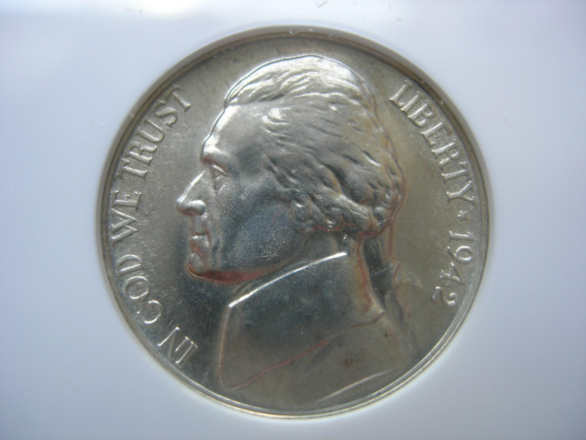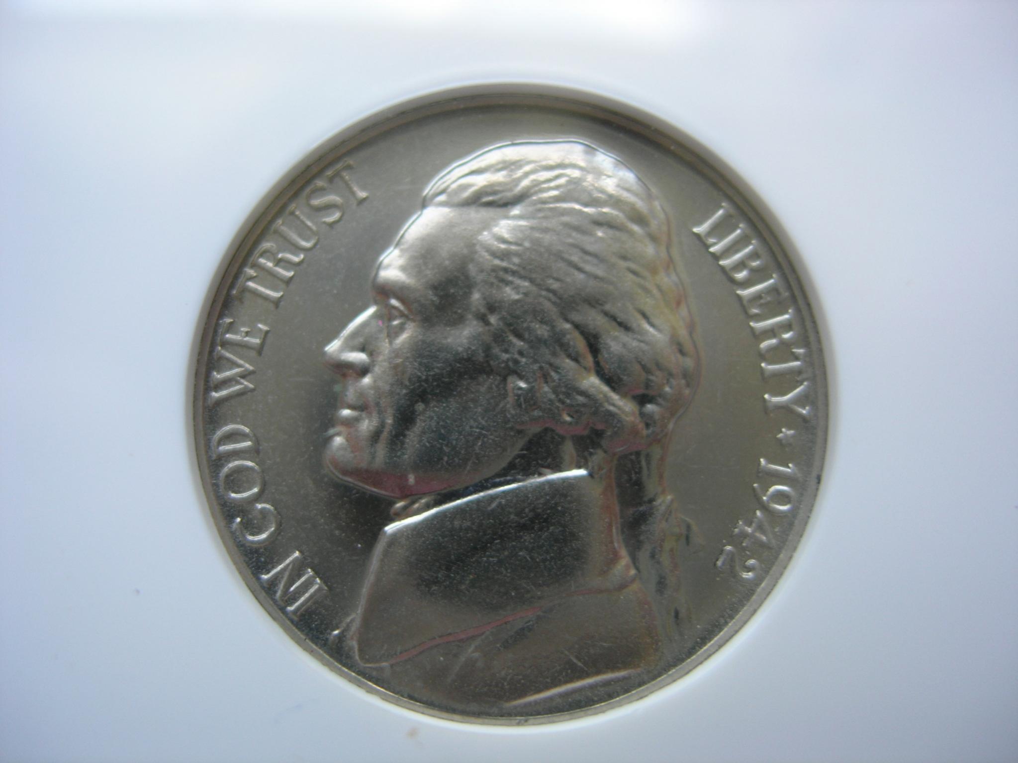 Not listed on the slab but if you look at the base of Jeffersons neck you'll see a egg shaped dot. That's the PUP for the 1942 PR WDDR-003 Class ll +Vl Distorted and Distended Hub Doubling Extra thickness shows on EPU USA & Five Cents Die Markers Obv.Large die gouge {dot} below Hair line back of collar Rev Diagonal die scratch above and right of short right window die dot inside left arch Type l Over all Rariety :Very rare find