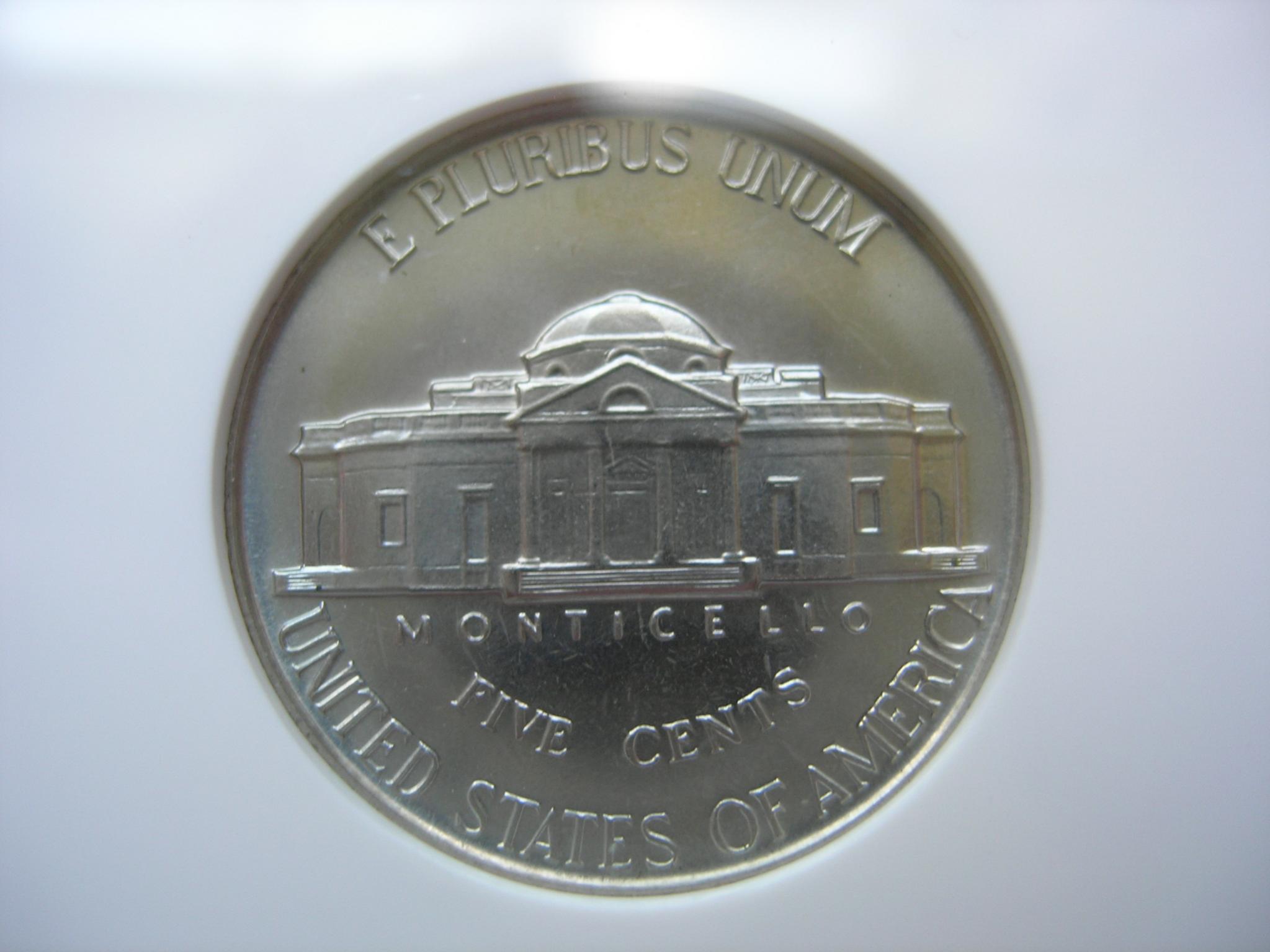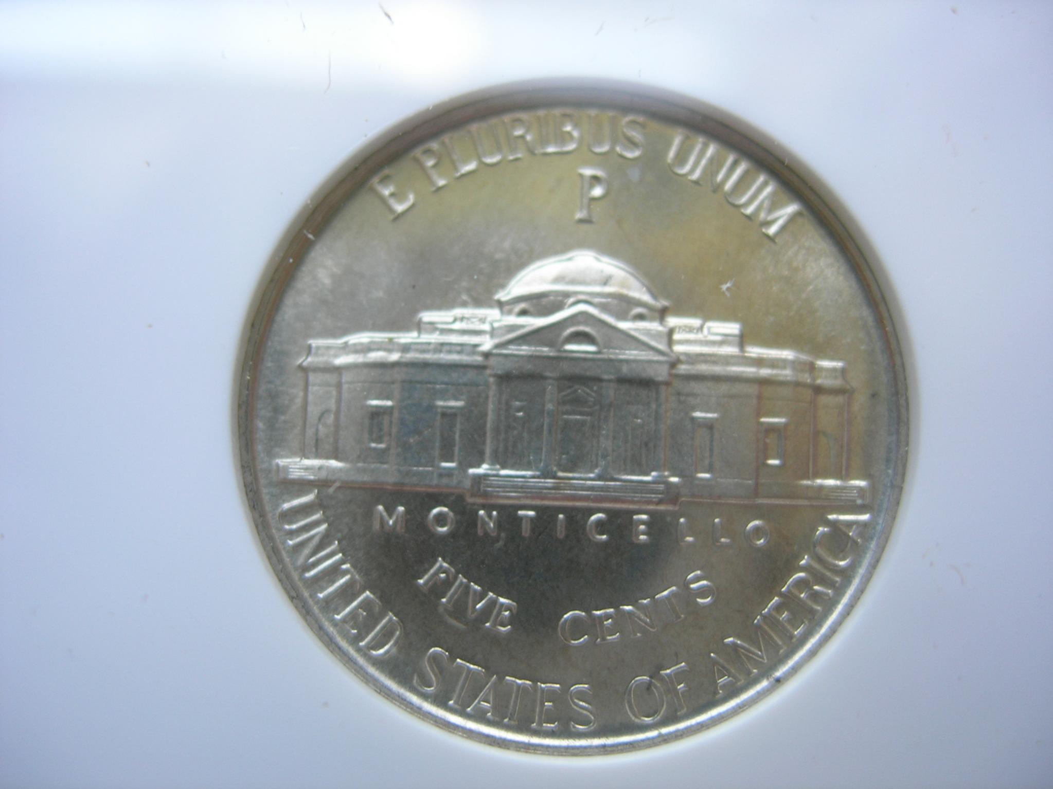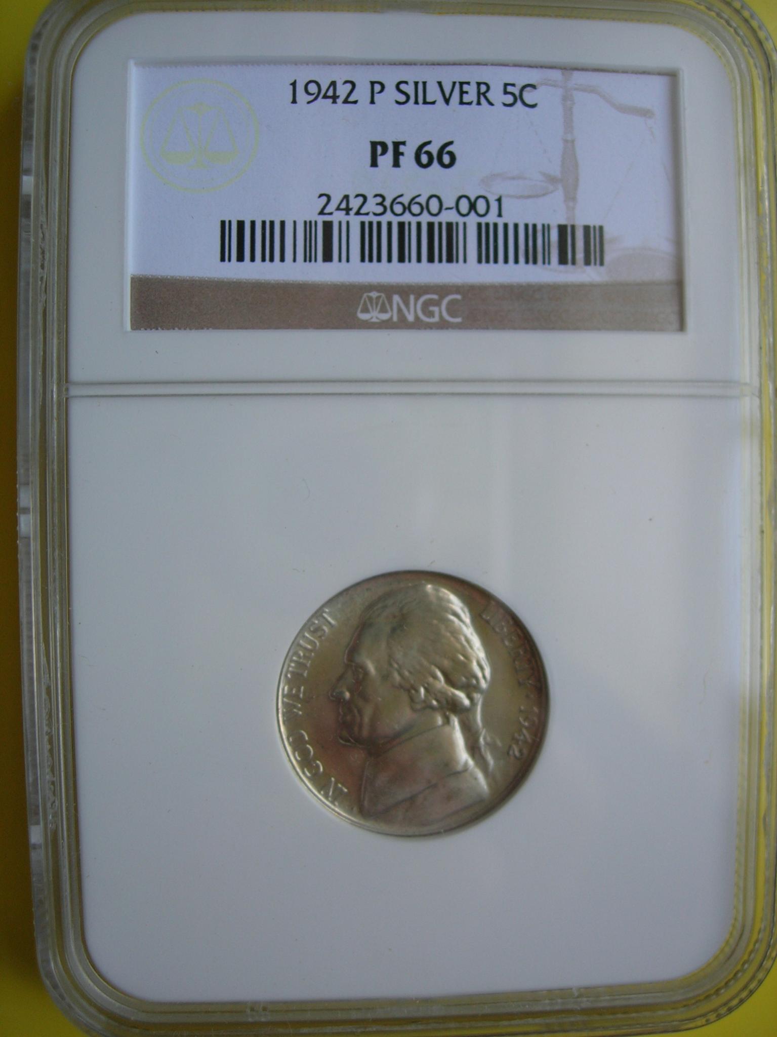 Not listed on the slab but if you look at the base of Jeffersons neck you'll see a egg shaped dot. That's the PUP for the 1942 PR WDDR-003 Class ll +Vl Distorted and Distended Hub Doubling Extra thickness shows on EPU USA & Five Cents Die Markers Obv.Large die gouge {dot} below Hair line back of collar Rev Diagonal die scratch above and right of short right window die dot inside left arch Type l Over all Rariety :Very rare find