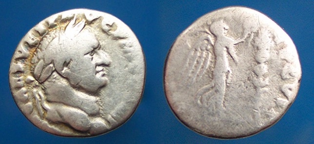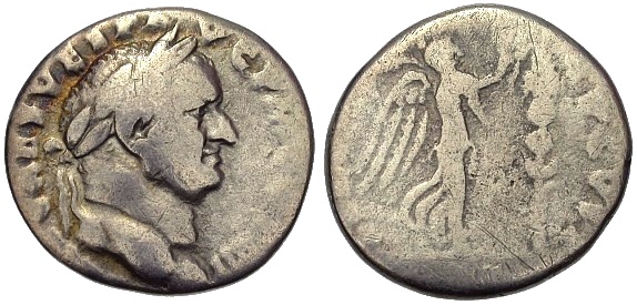 My first denarius was of Vespasian, and I finally upgraded it The picture is a little bright, but I was trying something new and the results were a little better. Vespasian, 1 July 69 - 24 June 79 A.D. Silver denarius, RIC II part 1, 362; SRCV I 2317, BMCRE II 74, F, 2.879g, 17.2mm, 195o, Rome mint, 72 - 73 A.D.; obverse IMP CAES VESP AVG P M COS IIII, laureate head right; reverse VICTORIA AVGVSTI, Victory advancing right, crowning legionary standard with wreath with right, palm across shoulder in left. "This type likely refers to the victory in Judaea but does not specifically identify that victory."