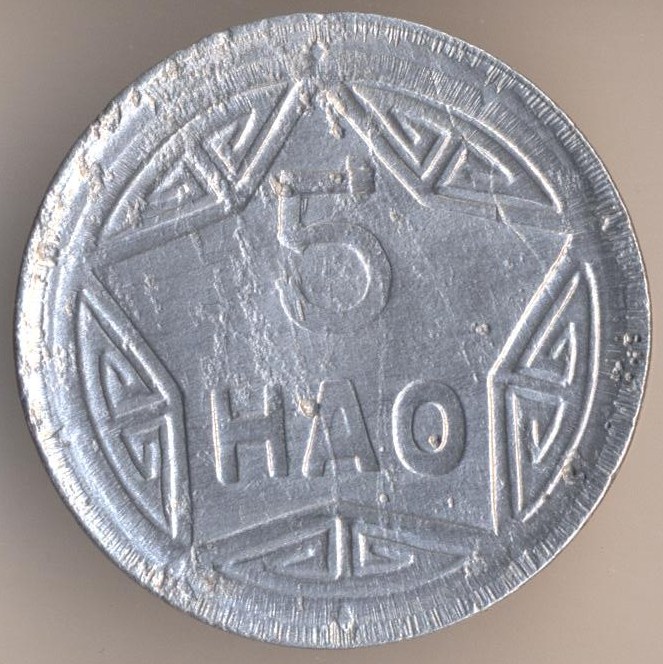 Democratic Republic of Viet Nam (communists). 5 hao 1946, aluminium, weight - 2,5 g., size - 27 mm, thickness - 2 mm, mintage - unknown. It is rather rare coin, I suppose.