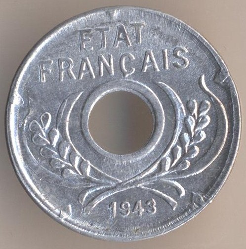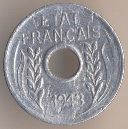 Vichy Regime. 1 centime 1943, aluminium, weight - 0,6 g., size - 17,3 mm, thickness - 1,2 mm, mintage - 15000000 pcs. The single release only. A coins of this type aren't very expensive even in Siberia. I've got mine for $6 only.