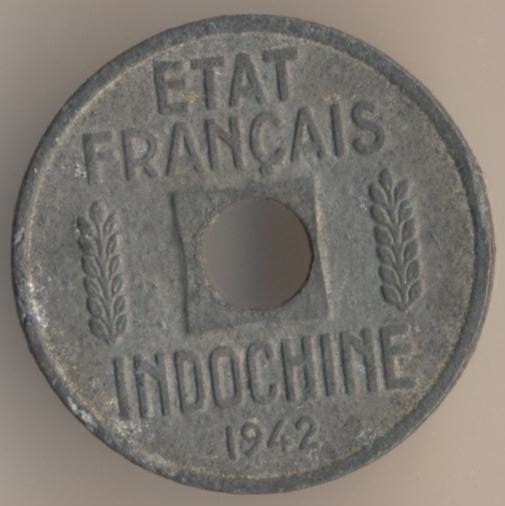 At 1887 Viet Nam became the part of French Indo-China - the French colony in Asia. Another lands which were the parts of the French Indo-China were Laos and Cambodia. It is good known that during the WW II Republic of France was occupied by the German and Italian military troops and became the Hitler's satellite (as the State of France). Another name of French State was the Vichy Regime. Colonial administration of French Indo-China recognized the Vichy Regime. Japanese troops controlled the territory of colony (de facto) but the French administration formally continued to fulfill the duties. Moreover, French Indo-China was the only French colony where a coins of the Vichy regime were released. It were a coins with the caption "Indochine" on the reverse and "Etat Francais" on the obverse.