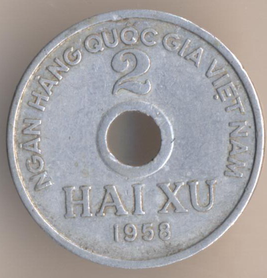 Democratic Republic of Viet Nam. Third nothern dong (the 1959's monetary reform: 1 dong = 10 hao = 100 xu). New coins were released at 1959 but with the date "1958". 2 xu 1958, aluminium, weight - 1,22 g., size - 22 mm, thickness - 1,6 mm, mintage - unknown. The single release only.