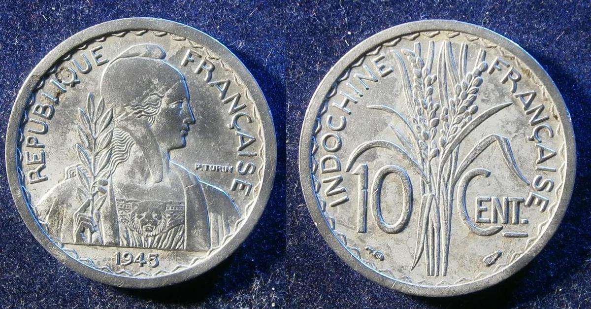 then a 10 cent piece from 1945 (no longer Etat Francaise, but proper French Indochina) FRVN10Cents1945.jpg