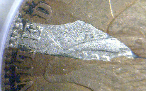 The details appear to be too sharp for it to be solder over the devices. It looks like it could be a silver fragment. Note the curvature between the "E" & "D" like it could be a remnant from a planchet strip. Chris