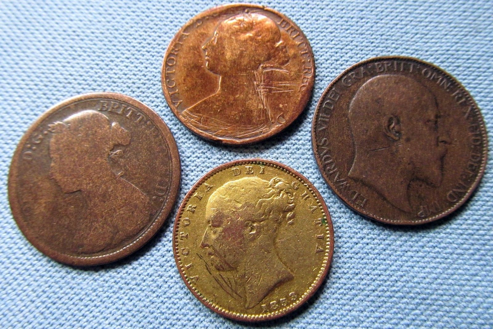 It's my understanding that the obverse of the farthing looked quite different from the sovereign in 1883 (the top / left 2 are farthings, with a different bust of Victoria and the legend "VICTORIA D:G: BRITT: REG: F: D:" instead of "VICTORIA DEI GRATIA"). Or is there something I'm missing?
