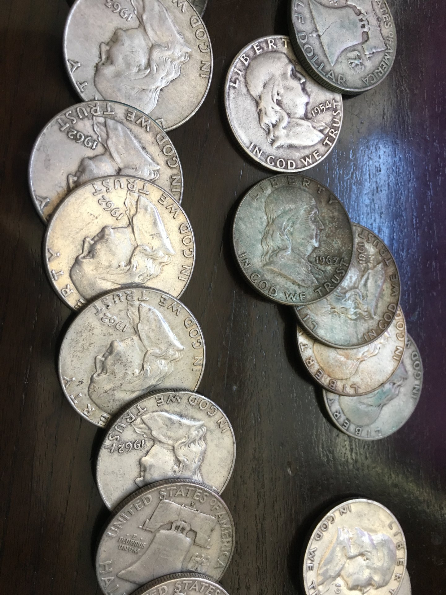 Hi All I think I want to make the jump in here - I have a bunch of silver dimes / halves - some have green PVC goo, most don't - But I want to sell these for the cash to start an actual collection. What is the best way to do this? Should I take the green ones to someplace and sell for melt? Do the halves - Franklin and Kennedy 64 - (They aren't all in bad shape) be sold individually, in groups, etc? Same question for the 250 silver Roosevelt dimes I have. Are there any variations i should look for before selling? Thank you - I think I want to focus on Early-ish American coins for now, just kind of based on the history of them and having a revolutionary war linked family member, I kind of like that era. This pic represents sort of the level of stuff I have now - Would rather have one nice example of each than a bunch of OK ones Also - I realize I just joined and have been asking a lot of questions and Im sorry. I just have jumped into hobbies too fast before and gotten burned so I want to be cautious!