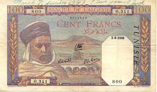 An interesting note Hiddendragon :thumb: I have the same but without written. I have instead another note, Banque De L'Algerie 100 francs, overprinted for use in Tunisia, dated September 2, 1940, with the words "I love you" Kiss an illegible signature (or G. luck...good luck?) and a date...March, 7 Sunday, 1943. Tunisia became a French protectorate in 1881, during World War II it was occupied by the Germans from December 1942 to March 1943. Liberation of Tunisia was the the greatest goal of Allied forces in North African campaign of 1942-1943. Americans began the invasion from the west in January 1943, the British advanced from the southeast in March, the Germans left Tunisia on May 12, 1943. The note becomes a valuable record of this historic moment: who else but an Allied soldier may have written these words? most unlikely not a Tunisian, the spoken languages in Tunisia were Arab and French, and the date correspond with the beginning of the British invasion. Who is the woman that you may write with love on a banknote? Well, we'll never know, but it's nice to see that even a simple bill can you tell us a page of history. petronius