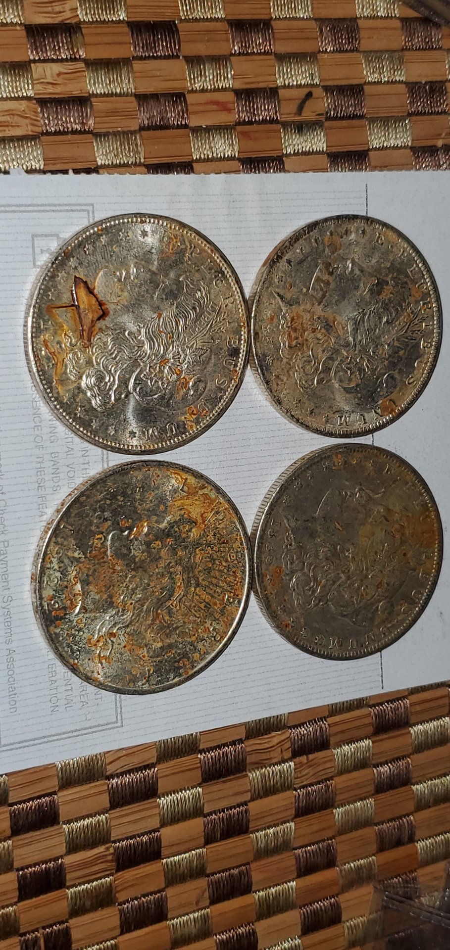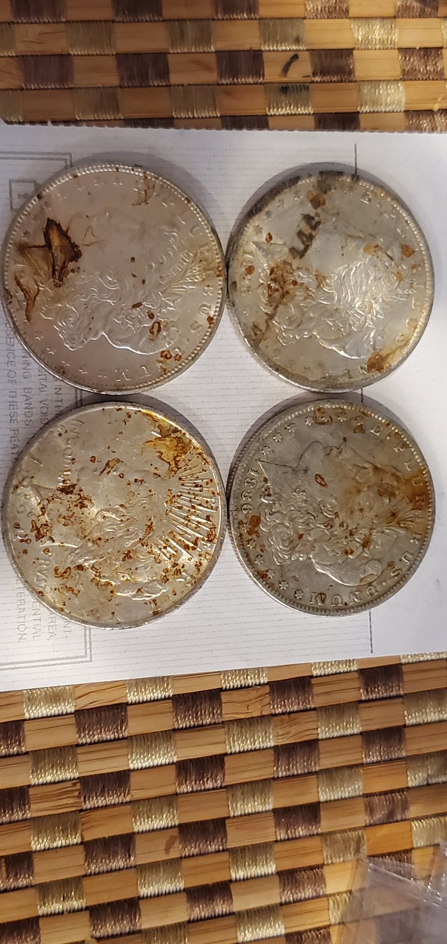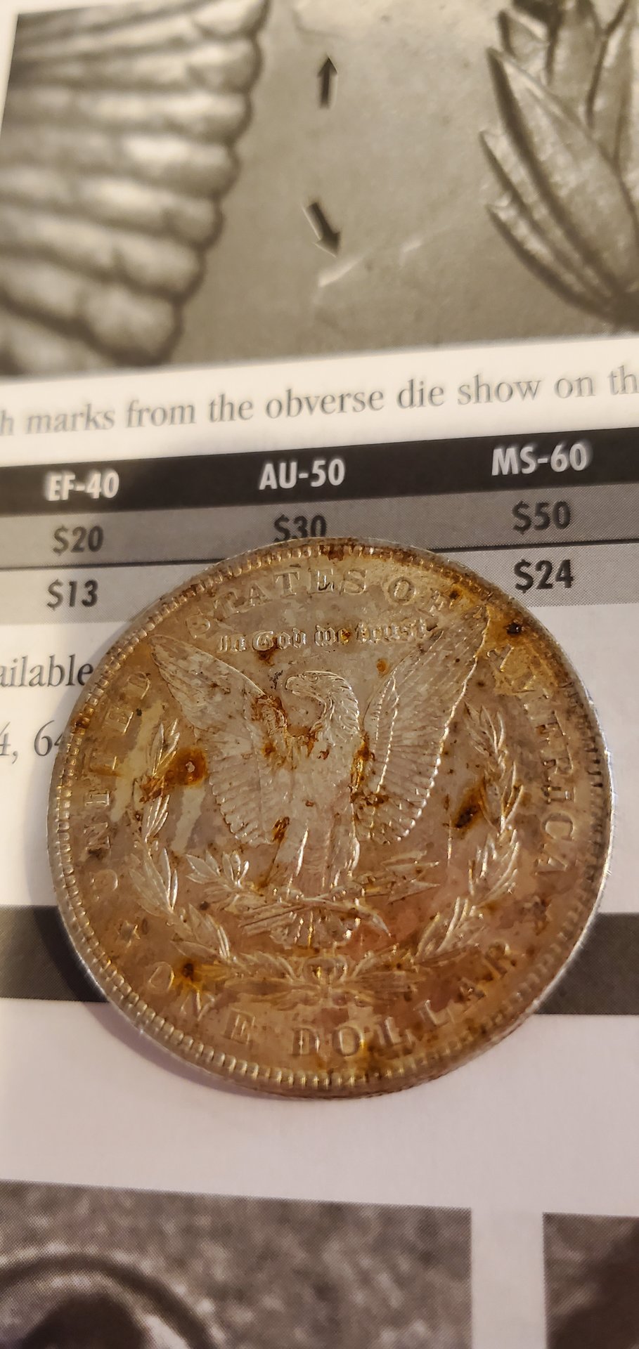 I recently picked up a few silver dollars from a hoard that was damaged when a water pipe leaked on them (possibly for quite some time). Most appear to have excellent detail, but the unsightly rust spots or corrosion put them in the "cull" price category.