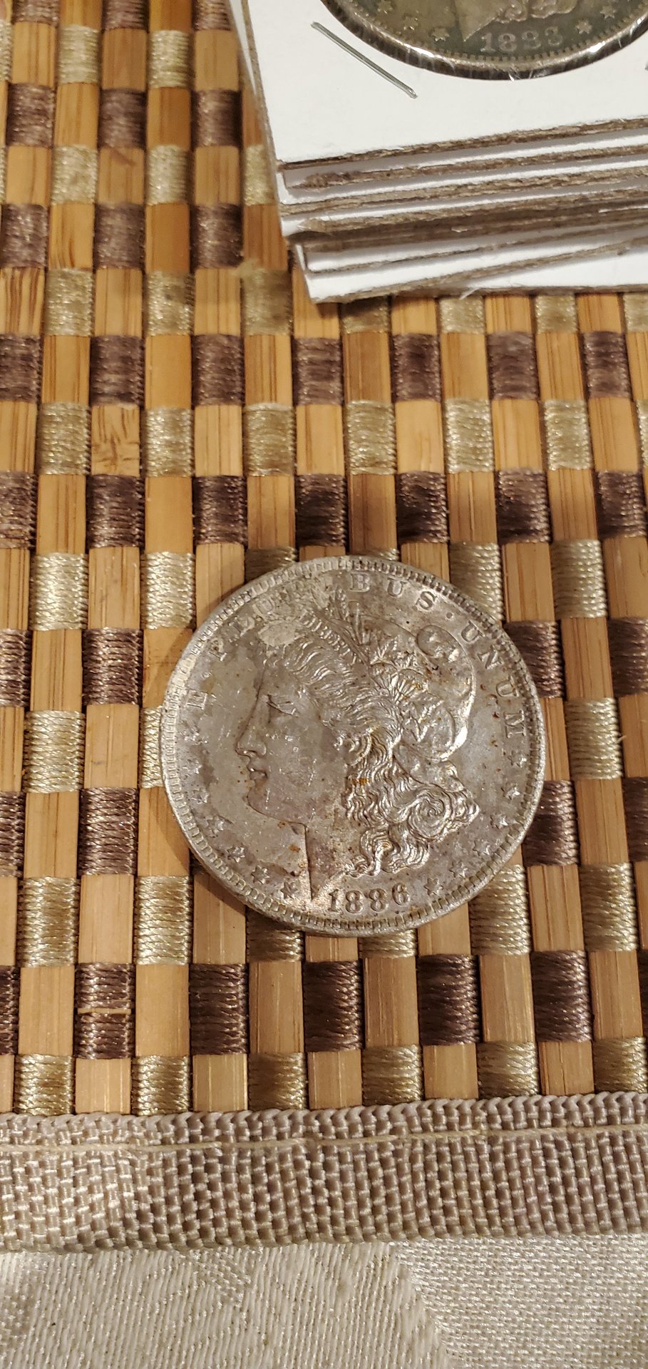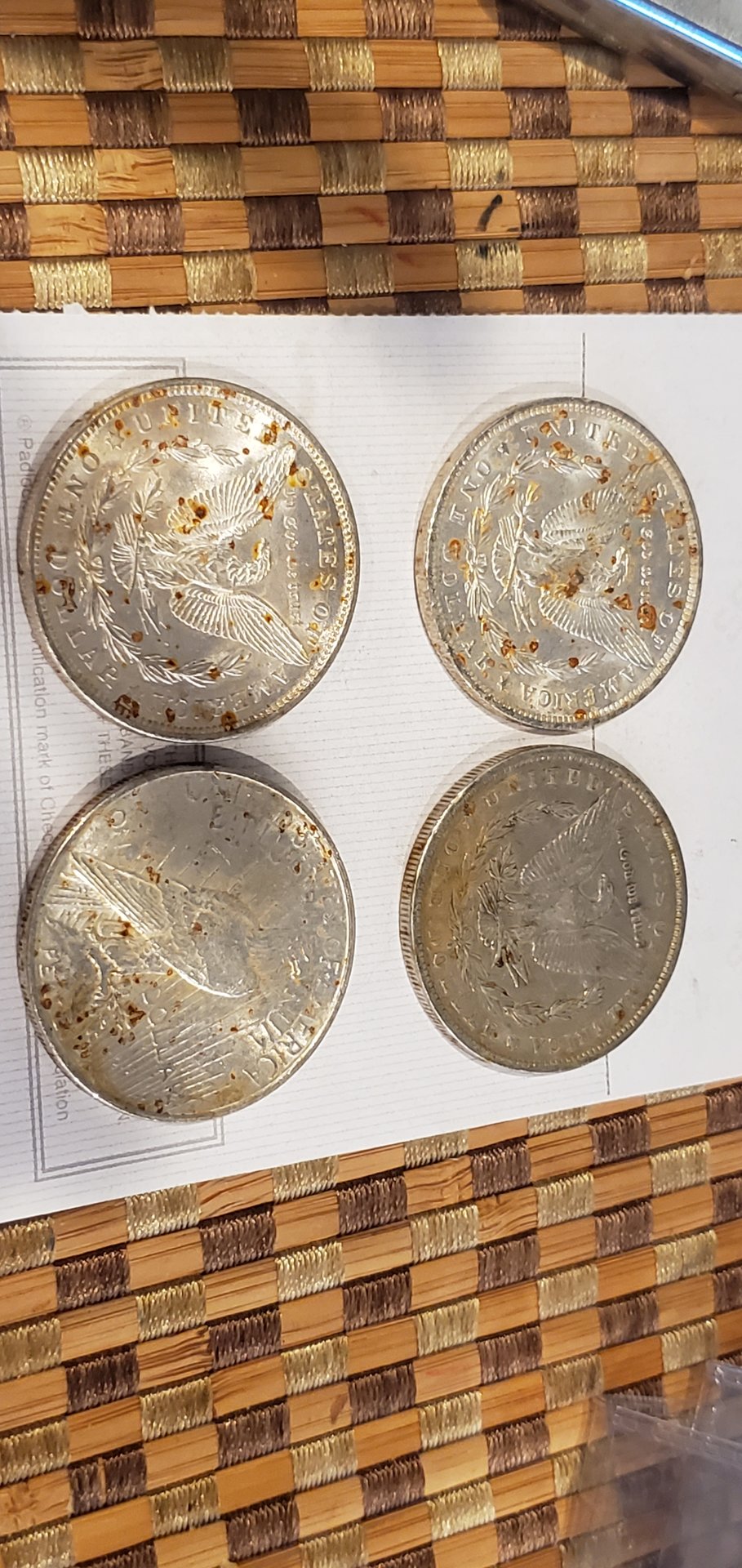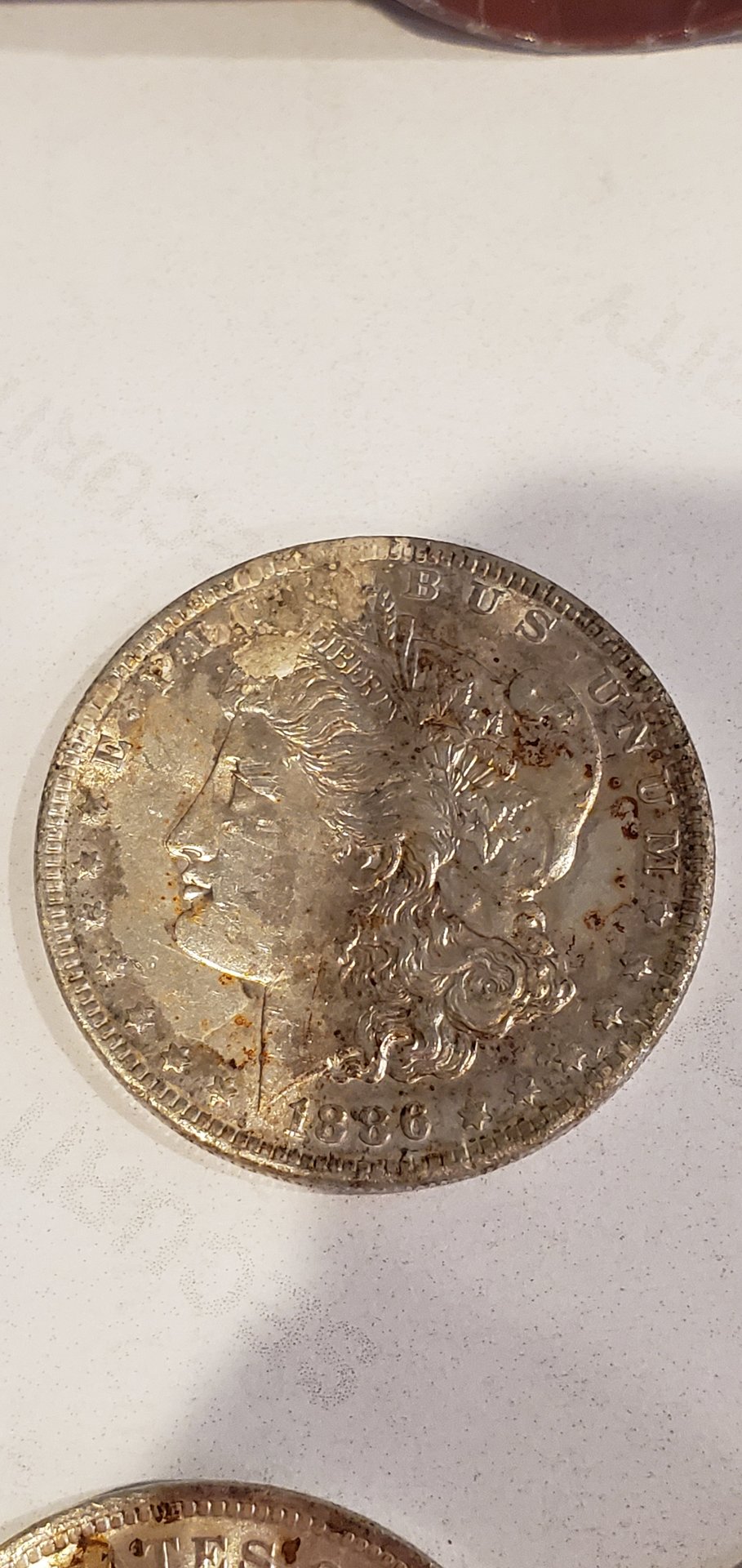 I recently picked up a few silver dollars from a hoard that was damaged when a water pipe leaked on them (possibly for quite some time). Most appear to have excellent detail, but the unsightly rust spots or corrosion put them in the "cull" price category.