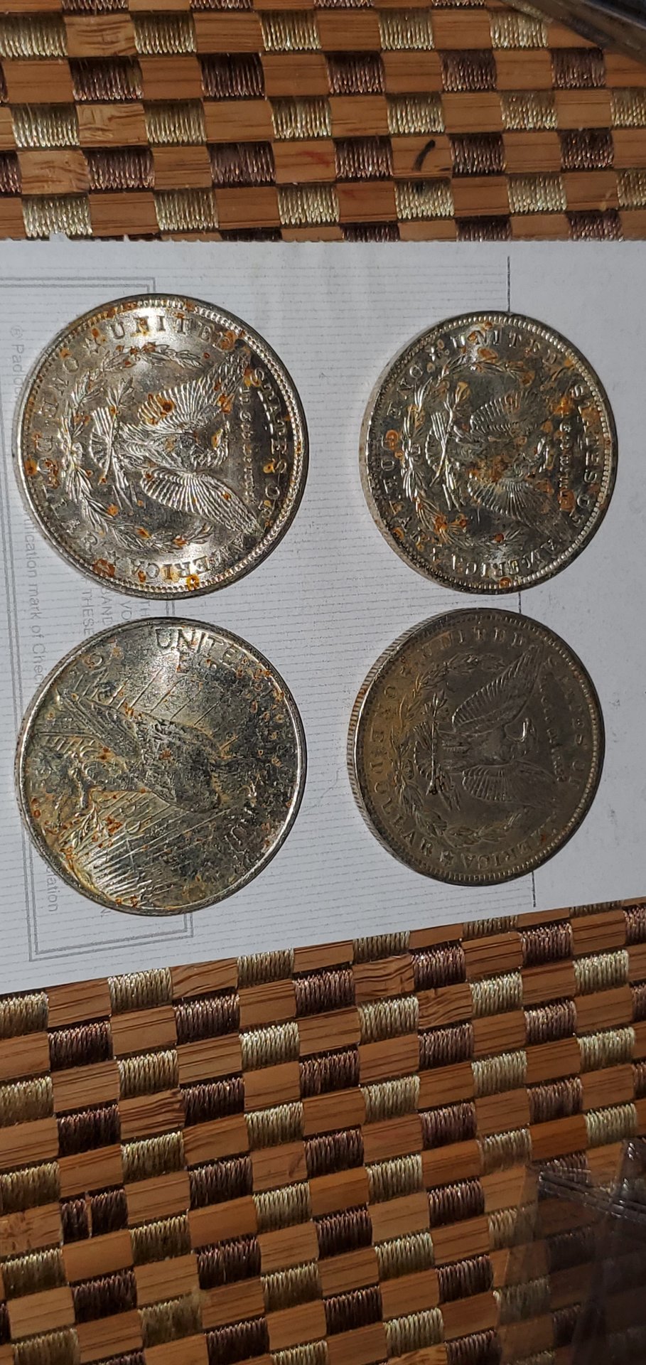I'm thinking the coins were stored in 2X2s with staples and moisture over the years, turned the coins ugly. I would try a weak dip on the worst one and see the results.