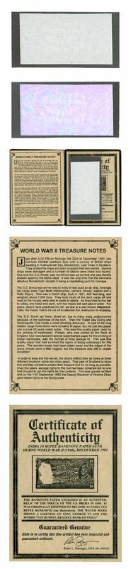 brokencompass: I see you posted this story at Coin Community also, but you haven't told us why you are sharing the story. Do you have any special connection with this story? Or are you just sharing an interesting read about history and numismatics? Do you collect/own any examples of these unprinted notes? It's quite an interesting story for sure. A rare find, for paper to survive so long in water, though it sounds like it was shielded by layers of heavier materials and the cold waters probably helped keep bacteria and other creatures from destroying it totally. If the pulp is held firmly in place, even when totally submerged the interlocking fibers of the paper should stay put and not come undone, even after all these years in such conditions, and especially since they'd been created under significant pressure then bound into whatever crates and containers kept them safe. Pretty neat! It appears someone who had these sheets in their possession trimmed out notes created collectibles from the paper stock. I read about this through some information available online, probably the same info where you borrowed some of the text of this story. Here is the link so that others who might be interested in the same information and seeing an image of the collector item, plus the source for the unquoted words can also read about it: 'WORLD WAR II TREASURE NOTES' [PDF] Thanks for sharing the story. I enjoyed it. :thumb: