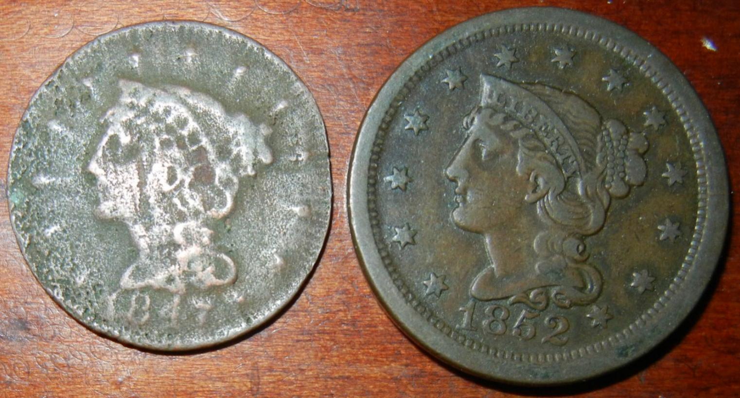 So I have this 1847 Large Cent that looks like it went through a voodoo head shrinking machine. As the pics show, it's smaller than a standard Large Cent and quite a bit thinner. I think it's just a case of corrosion but I'm willing to entertain other theories, especially if those theories involve a mint error! (fingers crossed). Thanks for any and all opinions.