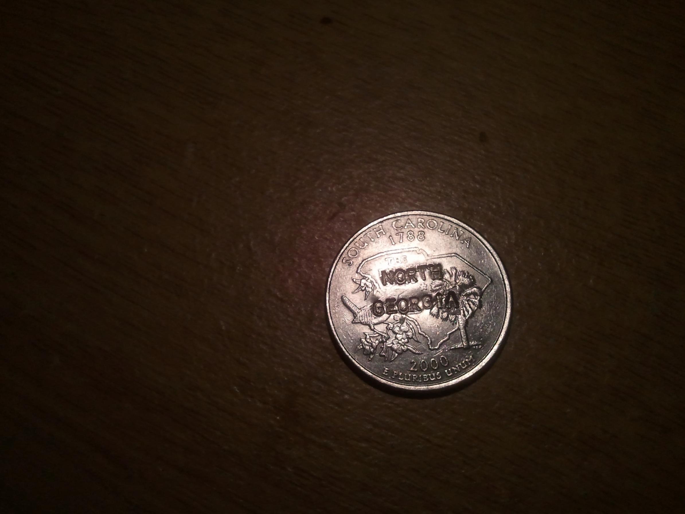 I found a 2000 South Carolina quarter that has been stamped (indented) with North Georgia. The front of the coin appears to have a marred area just below the nose... any thoughts?