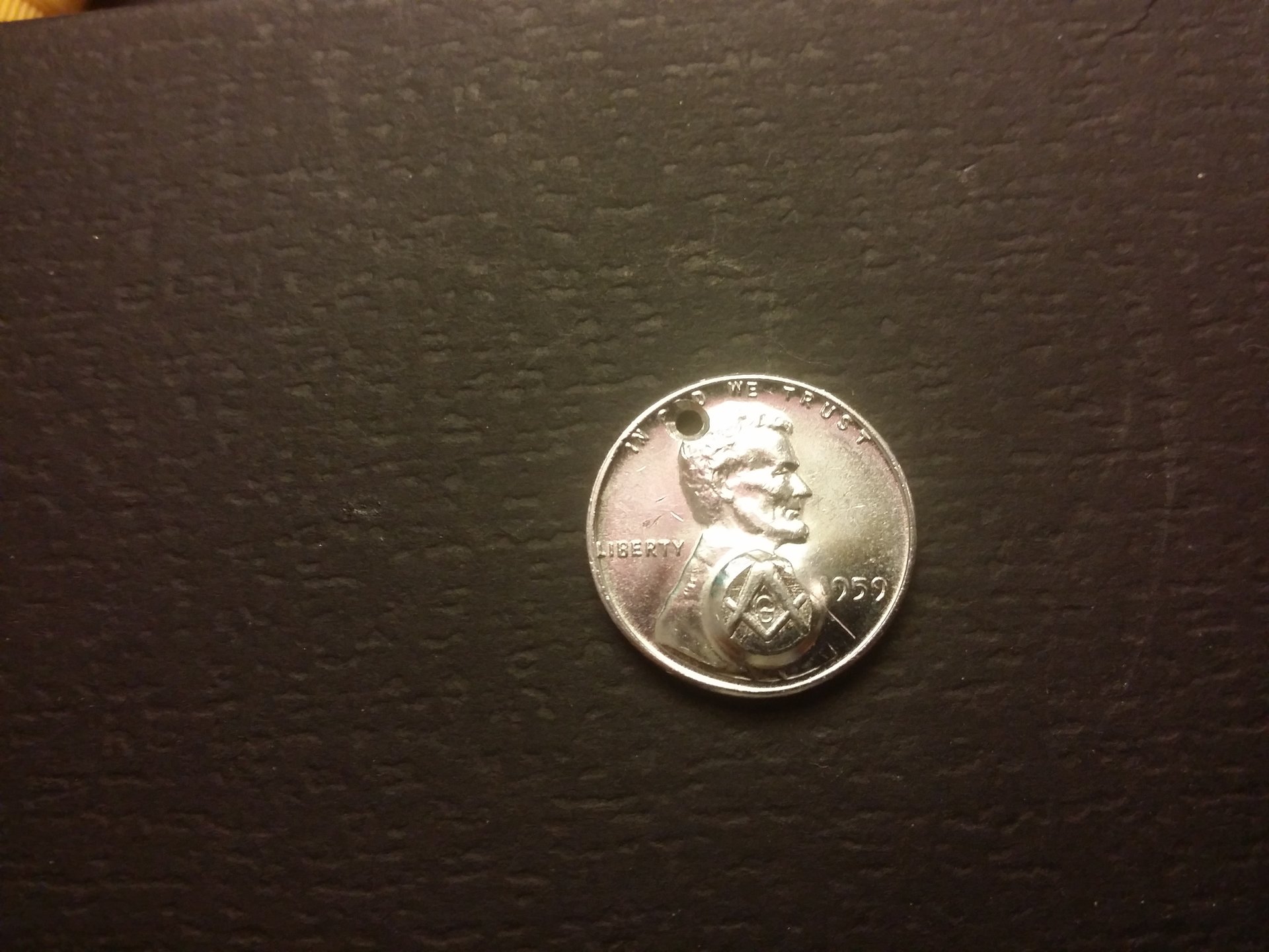 Just curious on any info. Its a 1959 unmarked penny stamped with the mason compass and ruler, only on one side. Doesn't seem magnetic at all. Can't weigh it at the moment. There's a slight pinkish shine to the metal. It's an item I found in my gpas belongings, think it's kinda cool. Is it worth anything besides sentimental? Is it plated or some other metal? Thanks for anything.