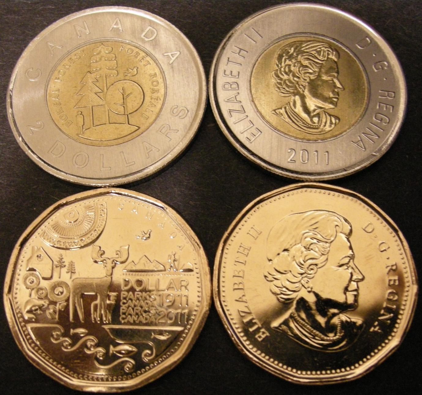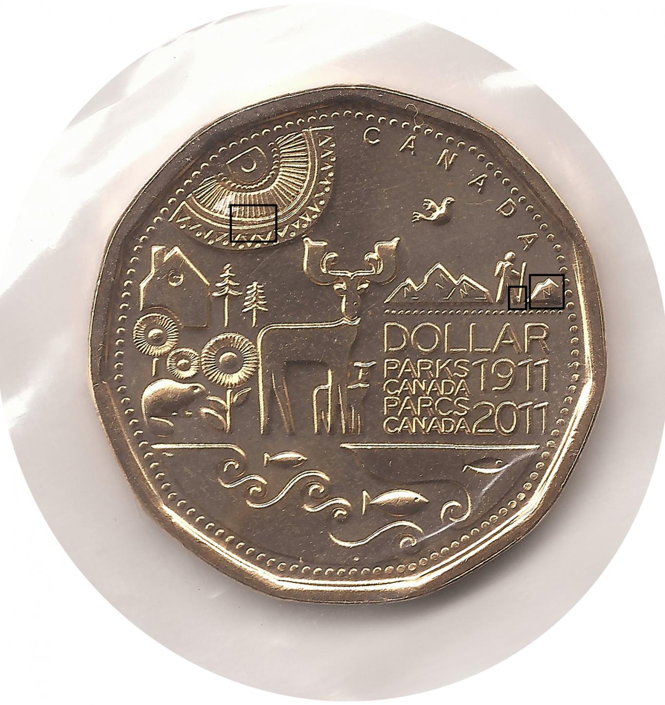 It's not an "N". It's a hiker holding a walking stick. On October 7, 2011, the Royal Canadian Mint and the Honourable Peter Kent, Minister responsible for Parks Canada, unveiled this special one-dollar commemorative circulation coin honouring the centennial of the founding in 1911 of the world’s first national park service, now known as Parks Canada. This unique Parks Canada 'centennial loonie' features stylized elements representing the national parks, national historic sites and national marine conservation areas of Canada, as well as the centennial dates, a hiker and a symbolic beaver.
